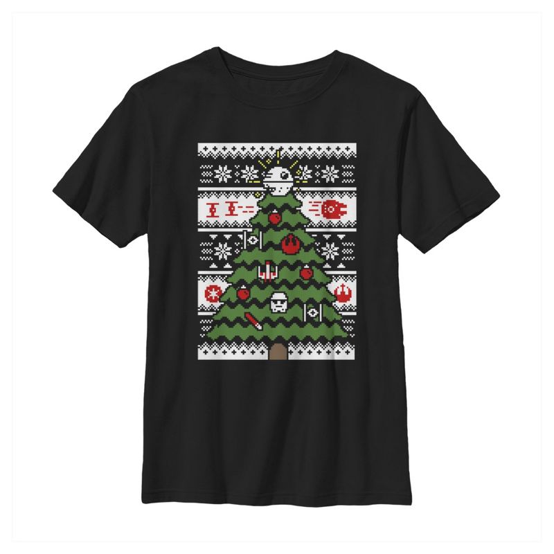 توجه إلى قمر إندور في غابة إندور لتستمتع بشجرة عيد ميلاد رائعة وقميص ستار وورز القبيح للأولاد! نجمة الموت فوق سترة بطبعة شجرة عيد الميلاد القبيحة، مع سفن فضائية في الخلفية على مقدمة هذا القميص الرائع من ستار وورز.