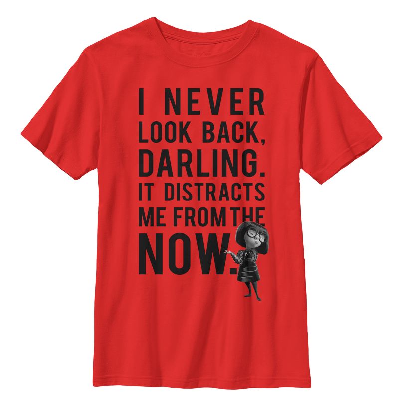 استلهم نصيحة صغيرة من تيشيرت "إيدنا مود" للأولاد من فيلم "الخارقون"! صُوّر تصميم الأزياء الشهير، إيدنا مود، إلى جانب عبارة "لا أنظر للخلف أبدًا يا عزيزتي. إنه يُشتت انتباهي عن اللحظة الحالية" على هذا القميص الجميل من "الخارقون".