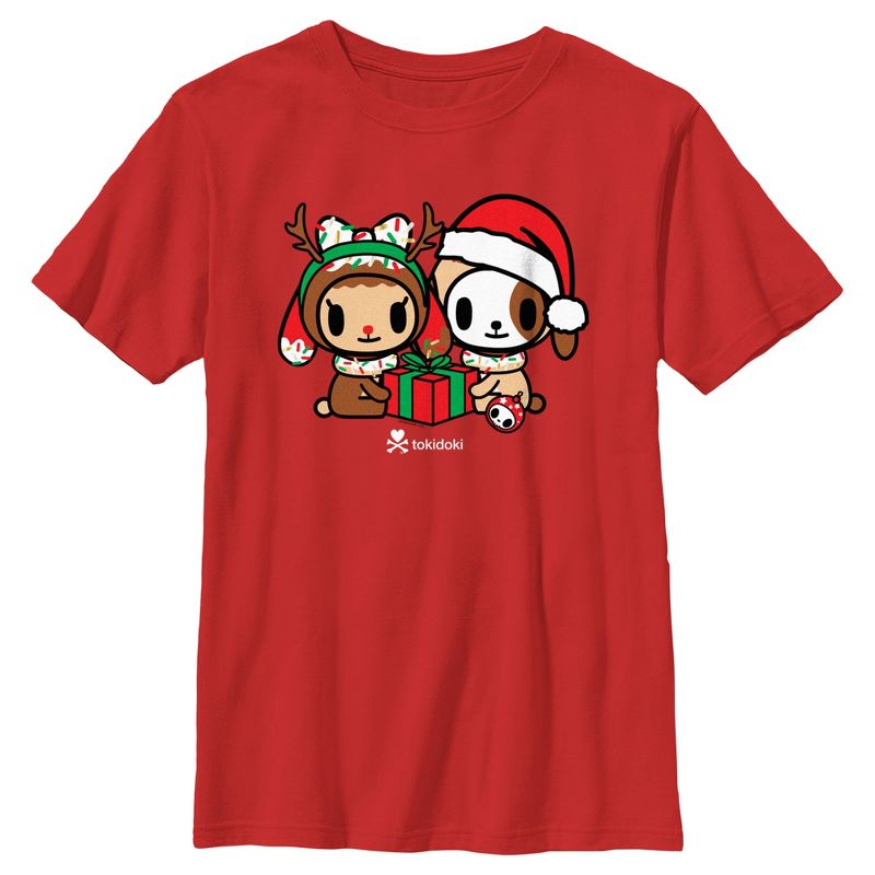 - تباهَ بأزيائكَ الأنيقة مع هذا التيشيرت الجديد للأولاد، مثالي لموسم الأعياد! يُظهر دونوتينو يرتدي قبعة سانتا كلوز ودونوتينا ترتدي قرون الرنة، ويتشاركان هديةً على الجهة الأمامية.