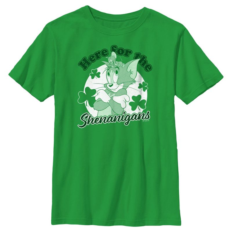 - تباهَ بملابسك الأنيقة مع هذا التيشيرت الجديد للأولاد، مثالي لعيد القديس باتريك! يتميز برسومات توم وجيري محاطة بأوراق النفل، وعبارة "هنا للمرح" مطبوعة بأحرف سوداء على الجهة الأمامية.