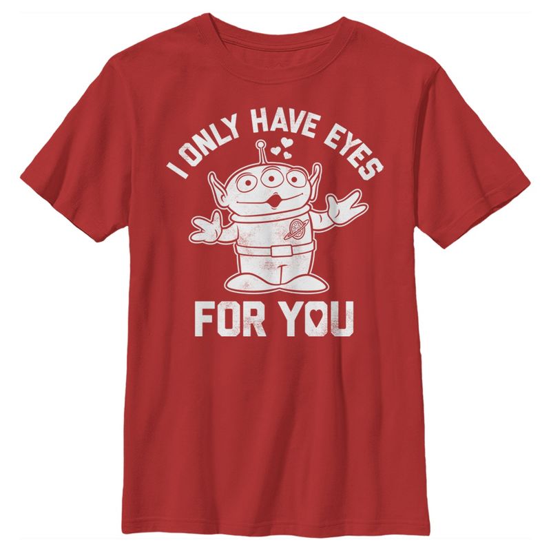 استمتع بأجواء عيد الحب مع هذا التيشيرت الأحمر الرسمي للأولاد من بيكسار، والمُرخص رسميًا، والمُزين برسومات "أنا فقط أملك عيونًا عليك"! يُزيّن هذا التيشيرت صورة أحد الرجال الخضر الصغار بقلوب فوق رأسه، مما سيجذب جميع مُحبي "قصة لعبة"، وربما حتى هدية عيد حب رائعة! تألق هذا الموسم مع هذا التيشيرت الجديد ذي الرسومات الجرافيكية!
