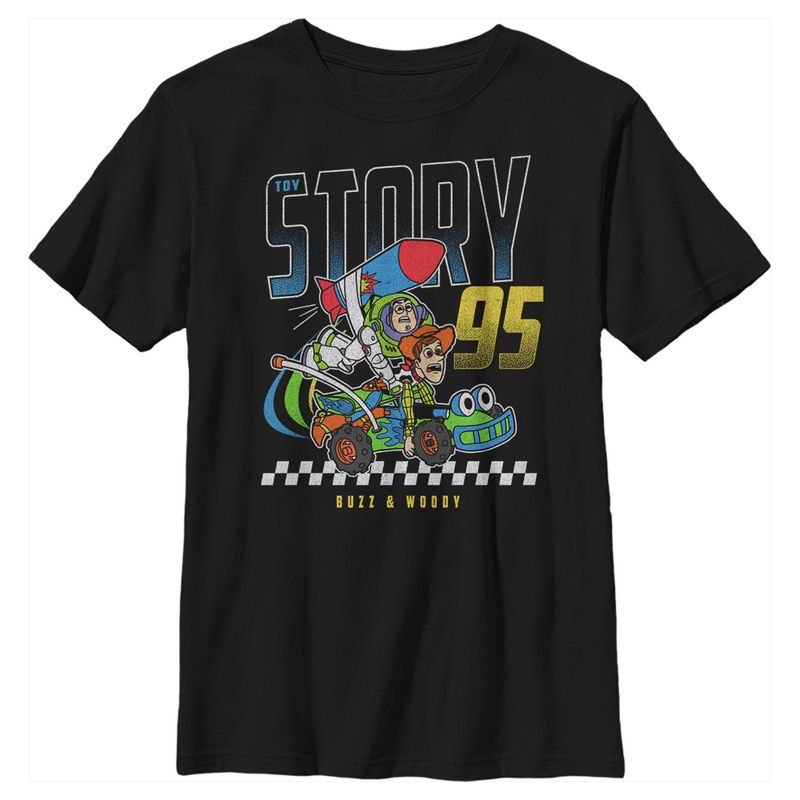- تباهَ بأزيائكَ الأنيقة مع هذا التيشيرت الجديد للأولاد، مثالي لجميع المناسبات! مُزيّن بصور باز لايتيير وودي على سيارة التحكم عن بُعد، الرقم 95، بتصميم سباقات كلاسيكي.
