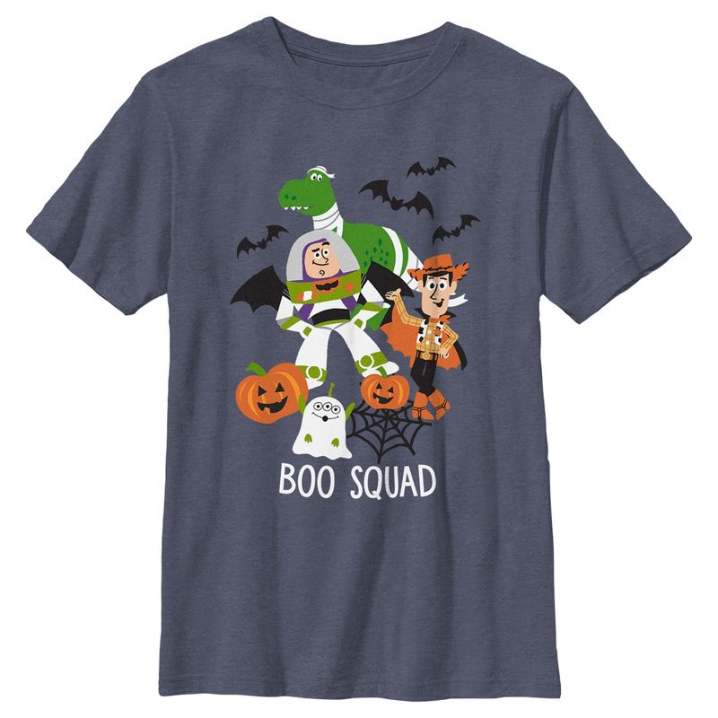 - تباهَ بملابسك الأنيقة مع هذا التيشيرت الجديد للأولاد، مثالي لعيد الهالوين! يحمل صور باز لايتيير، وودي، ريكس، ورجل أخضر صغير جاهز لطلب الحلوى، وأسفله عبارة "بو سكواد".