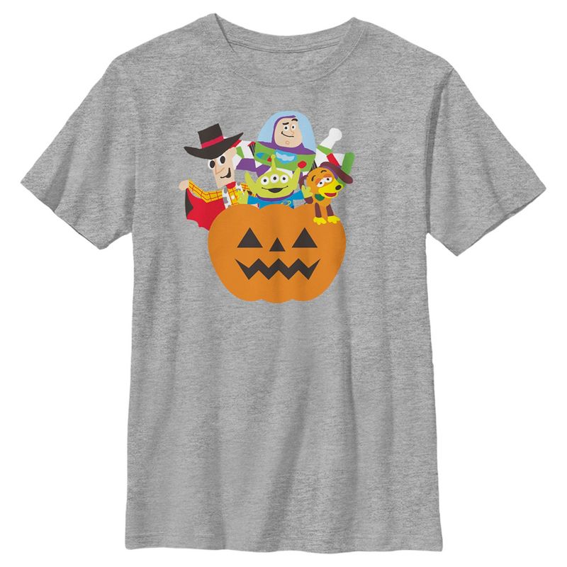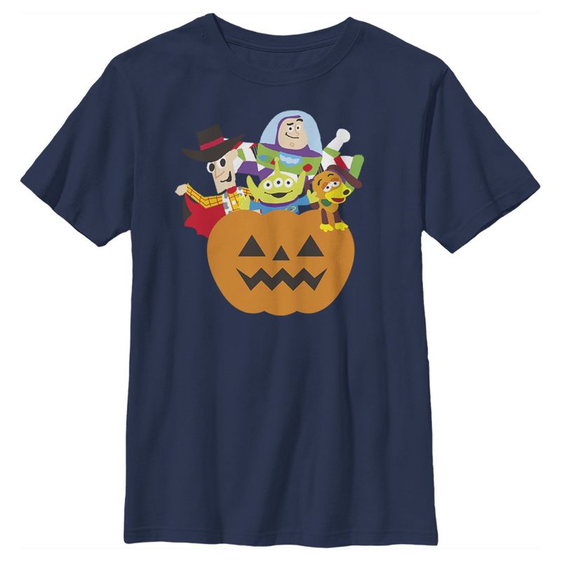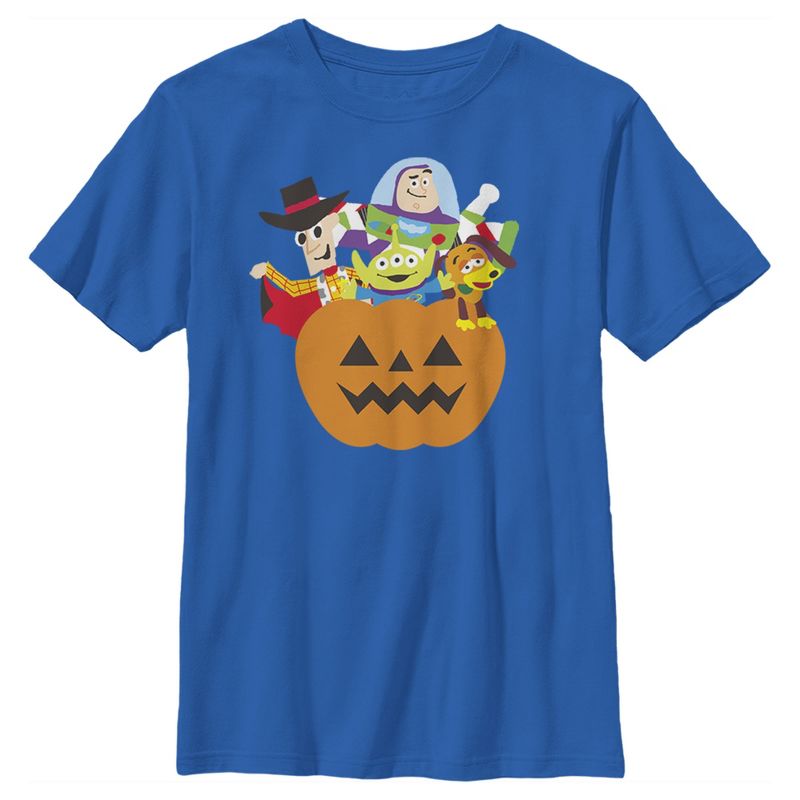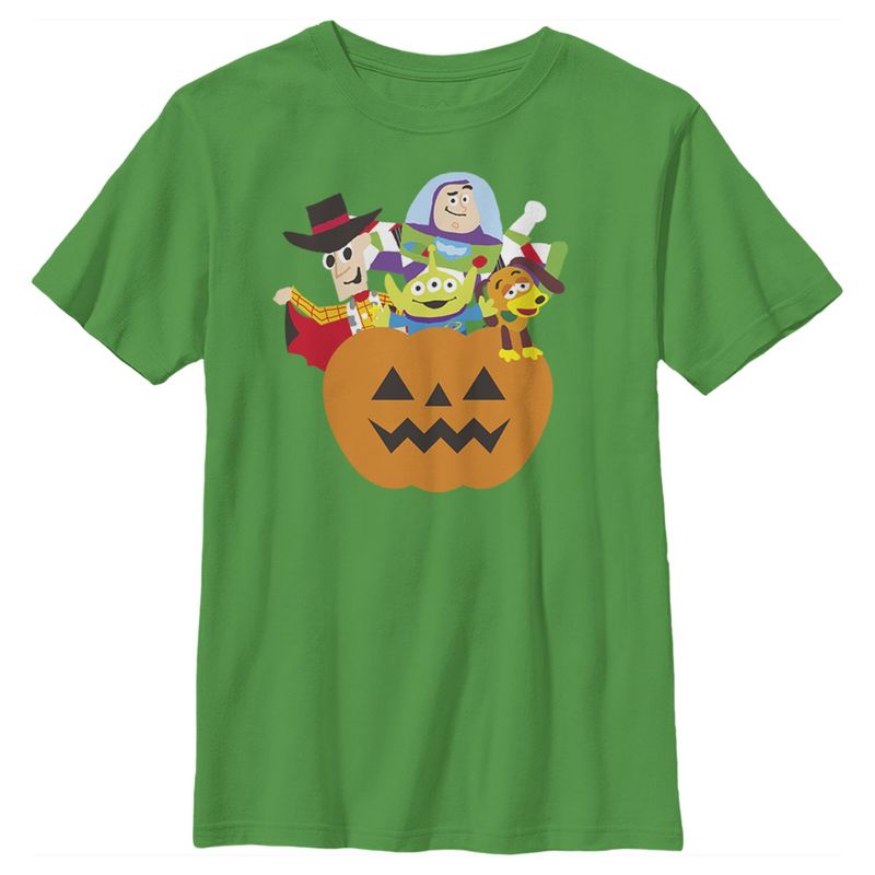 ما أجمل من الحلوى؟ تيشيرت "توي ستوري هالوين توي ترايتس" للأولاد، بالطبع! هذا التيشيرت المرح للهالوين مزين بشخصيات وودي، باز، سلينكي، وكائن فضائي، جميعهم داخل فانوس جاك أو فانوس.