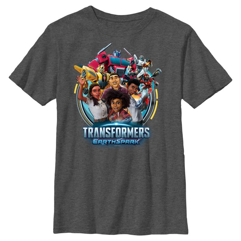 - أظهر مهاراتك مع هذا التي شيرت الجديد الأنيق للأولاد والذي يعد مثاليًا لكل المناسبات، حيث يتميز بصورة جماعية دائرية لـ Optimus Prime وBumblebee وThrush وTwitch وDot وAlex وRobby وMo مع شعار Transformers: EarthSpark أدناه!