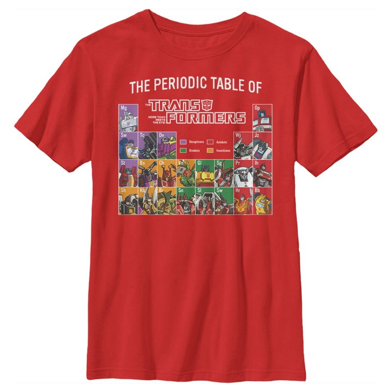 - تباهَ بأزيائكَ المميزة مع هذا التيشيرت الجرافيكي الجديد والأنيق للأولاد، مثالي لجميع المناسبات! يتميز بجدول دوري لجميع شخصياتكم المتحولة المفضلة، بما في ذلك أوبتيموس برايم، وبامبلبي، وسلاج، وبومبشيل، وباراچ، وغيرها الكثير!
