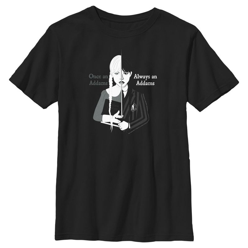 - تباهَ بأزيائكَ الأنيقة مع هذا التيشيرت الجديد للأولاد، مثالي لجميع المناسبات! يتميز بنسختين كرتونيتين من وينزداي وجودي آدامز، إلى جانب عبارة "Once an Addams، always an Addams" مطبوعةً بأحرف سوداء وبيضاء على الجهة الأمامية.