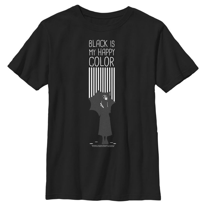 - تباهَ بملابسك مع هذا التيشيرت الجديد والأنيق للأولاد، مثالي لجميع المناسبات! يتميز برسم أبيض وأسود ليوم الأربعاء تحت مظلة، وخطوط بيضاء، وعبارة "الأسود هو لون سعادتي" على الجهة الأمامية.