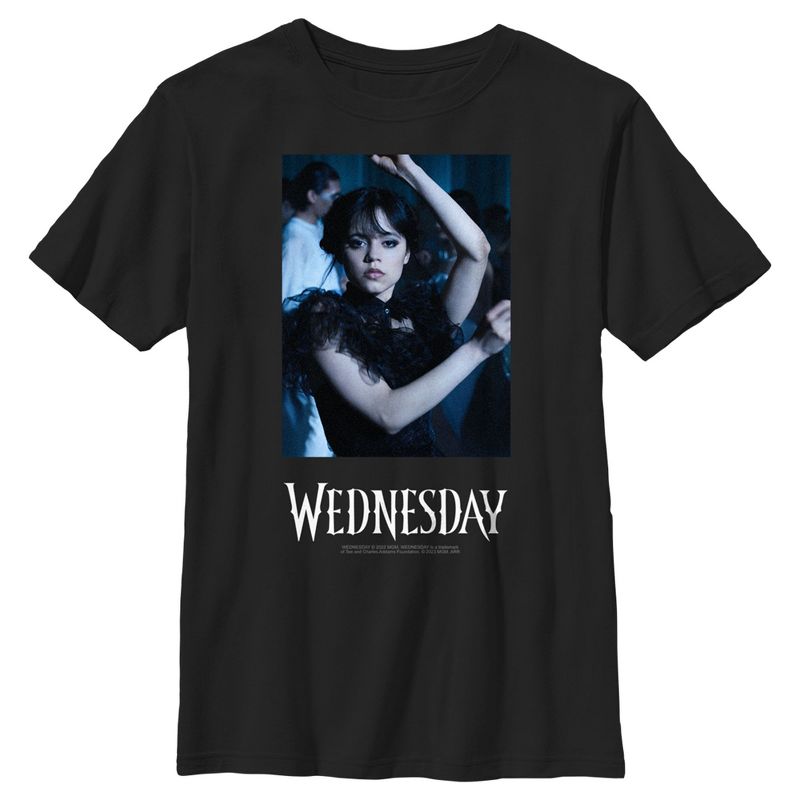 - تباهَ بأزيائكَ الأنيقة مع هذا التيشيرت الجديد للأولاد، مثالي لجميع المناسبات! يتميز بمشهد رقص الأربعاء الشهير مطبوعًا على الجهة الأمامية مع شعار السلسلة أدناه!