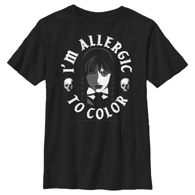 - تباهَ بملابسك مع هذا التيشيرت العصري الجديد للأولاد، مثالي لكل مناسبة! يحمل صورة وجه وينزداي آدامز محاطًا بعبارة "أنا أعاني من حساسية تجاه الألوان"، بالإضافة إلى جمجمتين!