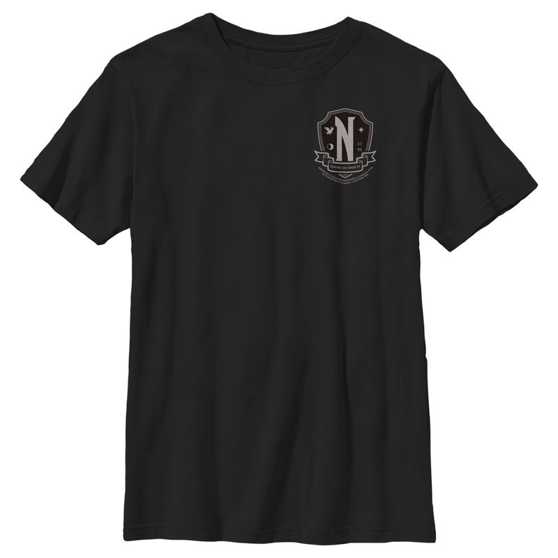 - استمتع بالراحة والأناقة في نفس الوقت مع تصميم هذا التي شيرت الجرافيكي المرخص رسميًا للأولاد من Wednesday.