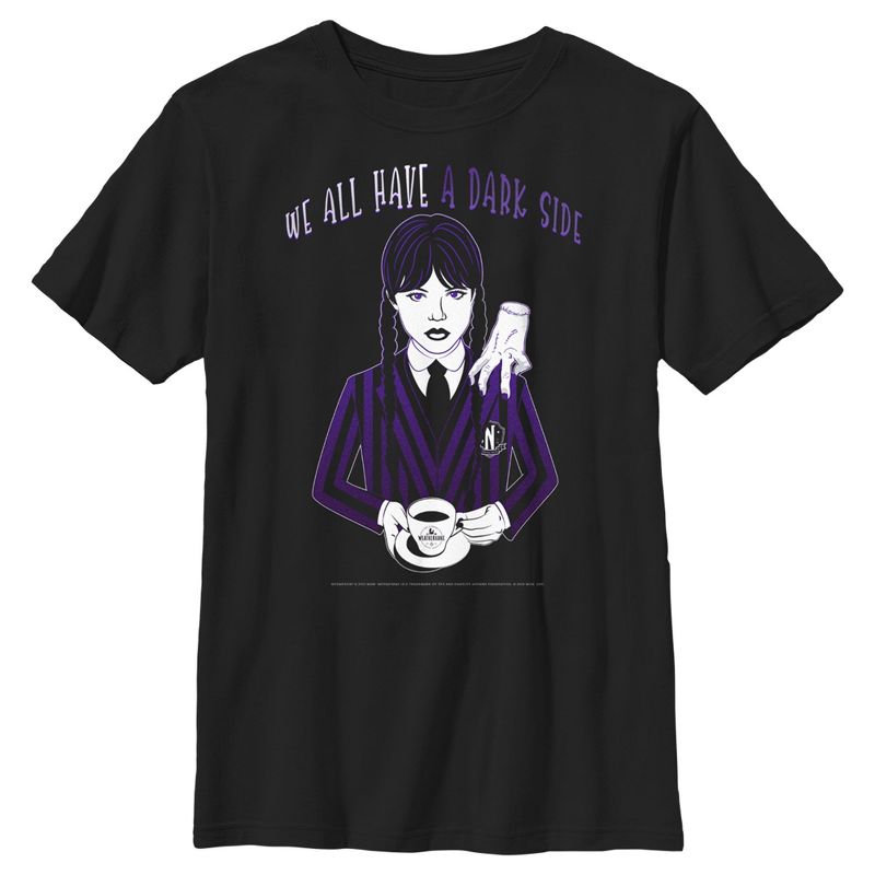 - تباهَ بإطلالة أنيقة مع هذا التيشيرت الجديد للأولاد، مثالي لجميع المناسبات! يتميز برسمٍ لـ Wednesday and Thing، مع عبارة "كلنا لدينا جانب مظلم" مطبوعةً بأحرف بيضاء وأرجوانية على الجهة الأمامية.