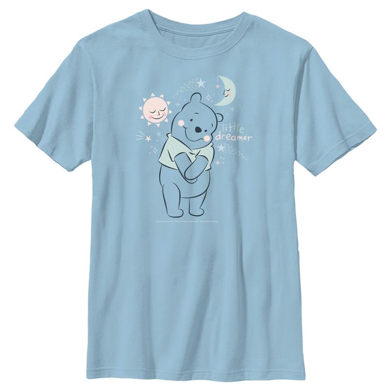- تباهَ بملابسك مع هذا التيشيرت الجديد الأنيق للأولاد، مثالي لجميع المناسبات! يحمل صورة بوه وهو يبتسم، وبجانبه هلال نصف هلال، وشمس، وشهب، وعبارة "حالم صغير".