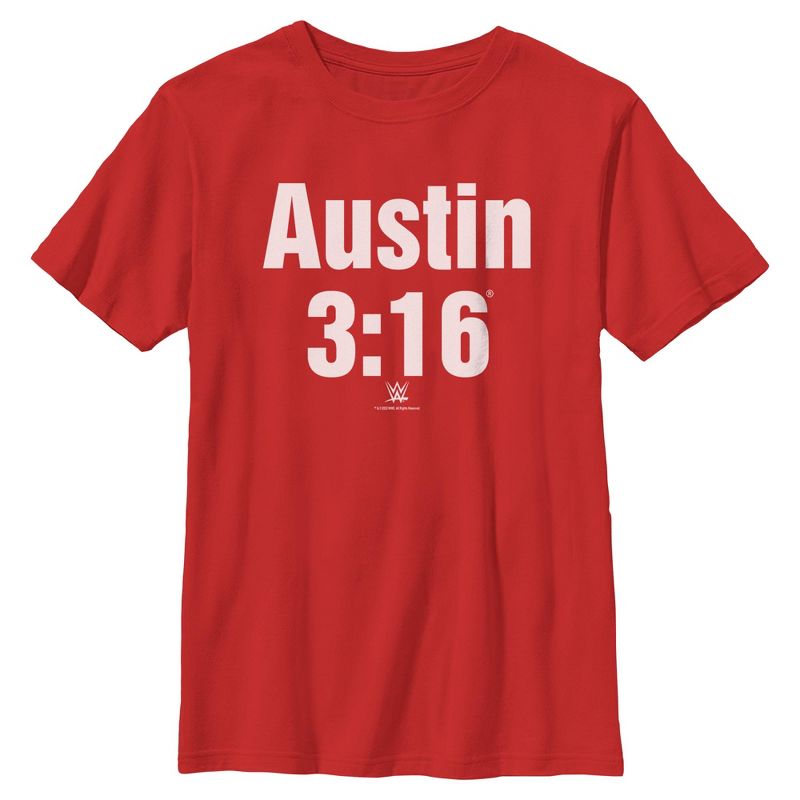 - تباهَ بملابسك الأنيقة مع هذا التيشيرت الجديد للأولاد، مثالي لجميع المناسبات! يحمل عبارة "Austin 3:16" بأحرف بيضاء كبيرة وواضحة، وشعار WWE صغير على الجهة الأمامية.