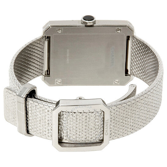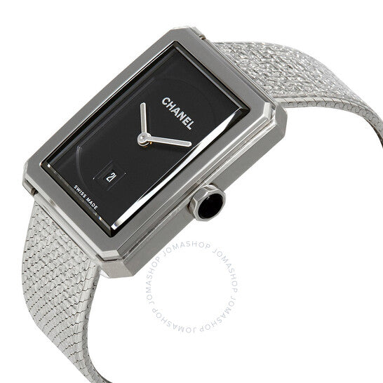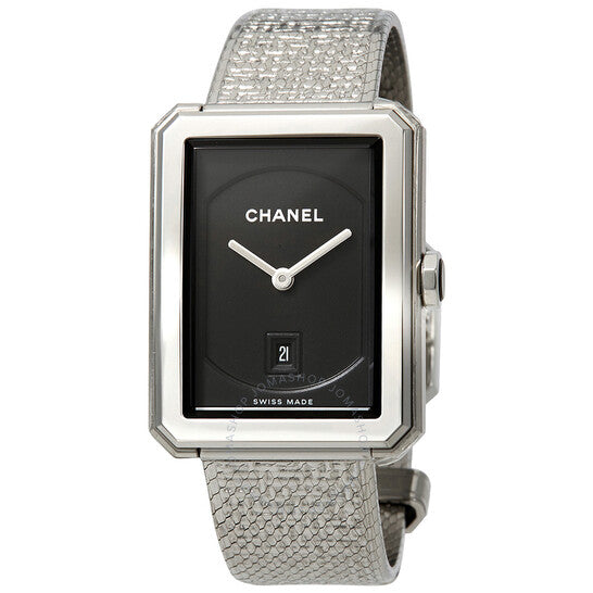 علبة من الفولاذ المقاوم للصدأ مع سوار من الفولاذ المقاوم للصدأ (بنقشة تويد). إطار ثابت من الفولاذ المقاوم للصدأ. ميناء أسود مزخرف بنقشة غيوشيه مع عقارب فضية مضيئة. بدون مؤشرات. نوع الميناء: تناظري. عقارب مضيئة. عرض التاريخ أعلى موضع الساعة السادسة. حركة كوارتز. زجاج كريستال مقاوم للخدش بتقنية دمج اللهب. تاج قابل للسحب/الدفع. غطاء خلفي صلب. شكل مستطيل. أبعاد العلبة: 34.6 مم × 26.7 مم. سُمك العلبة: 7.33 مم. مشبك تانغ. مقاومة للماء حتى عمق 30 مترًا / 100 قدم. الوظائف: التاريخ، الساعات، الدقائق. تصميم ساعة فاخرة. علامة الساعة: صناعة سويسرية. ساعة شانيل بوي فريند نسائية بمينا غيوشيه أسود H4878
