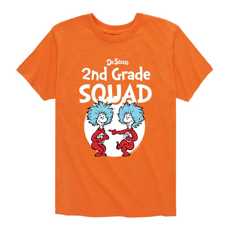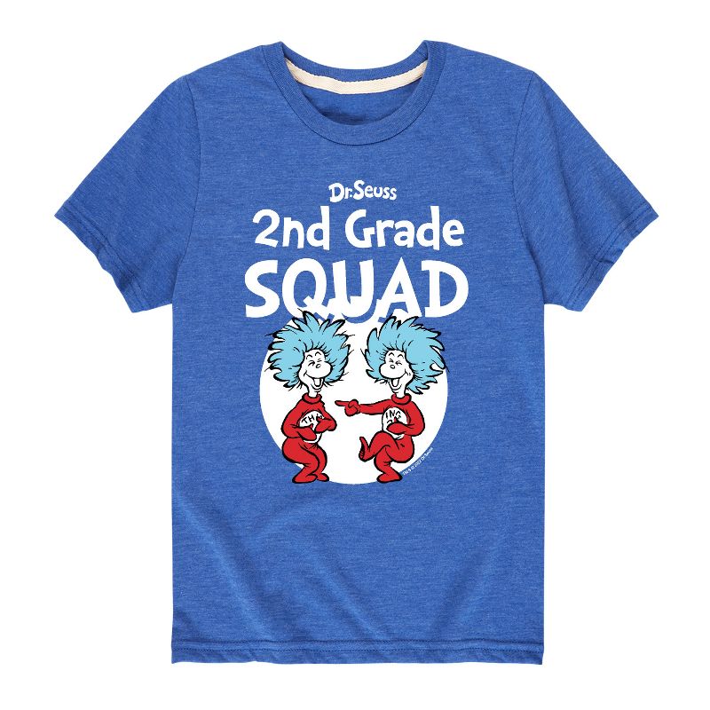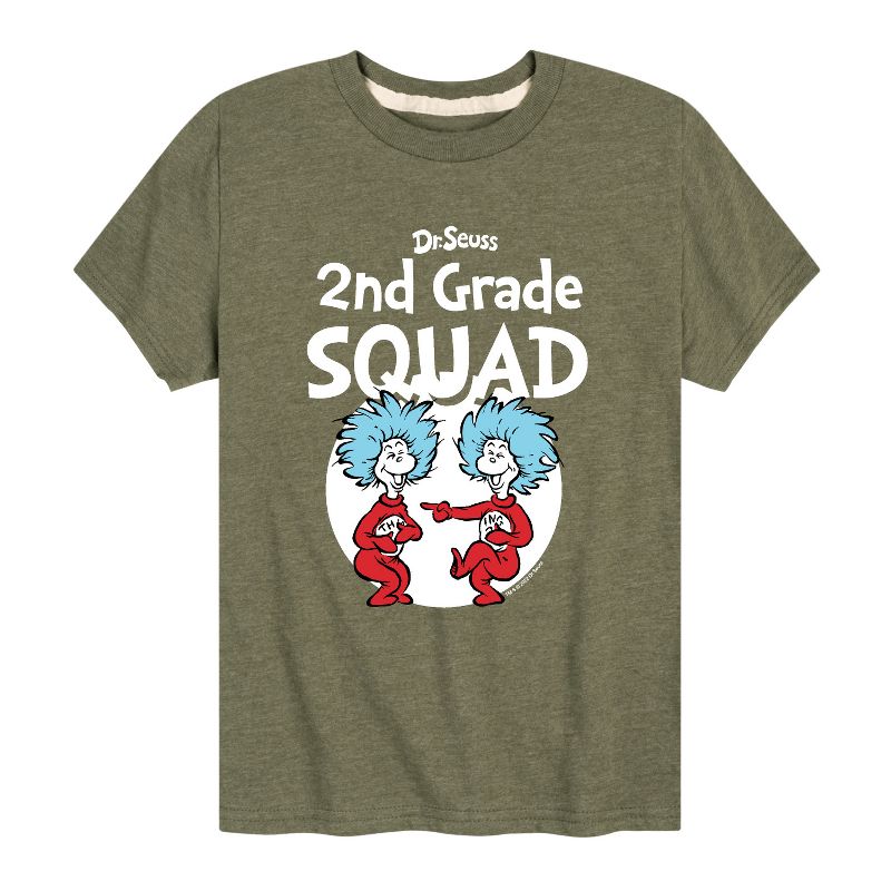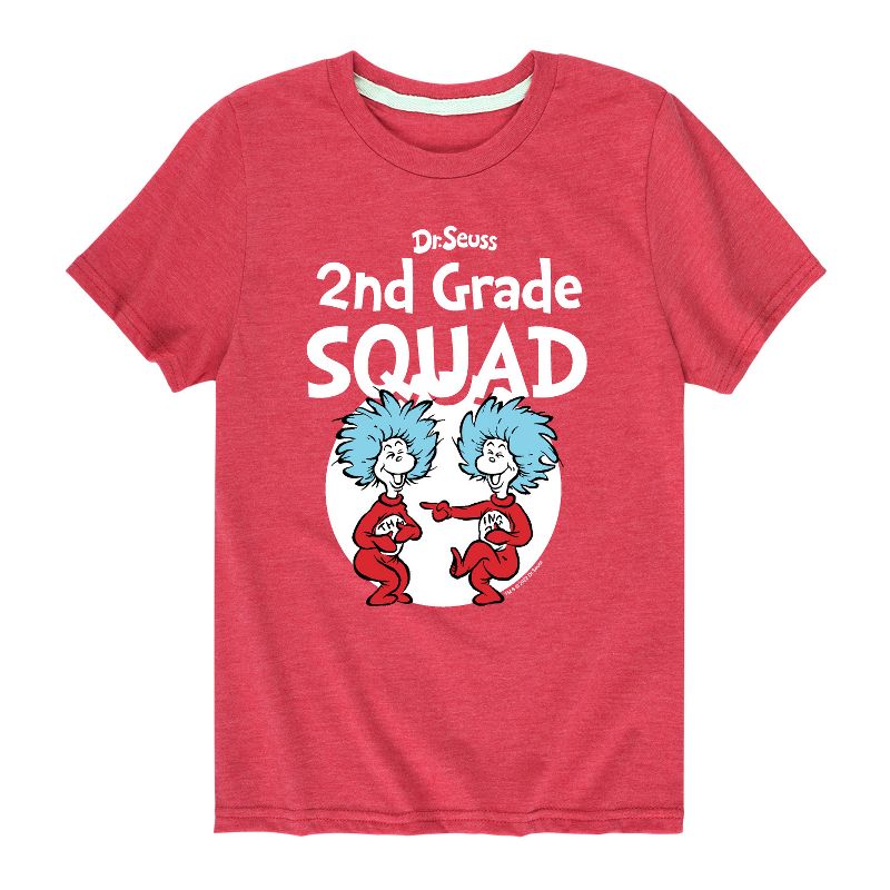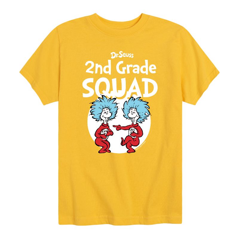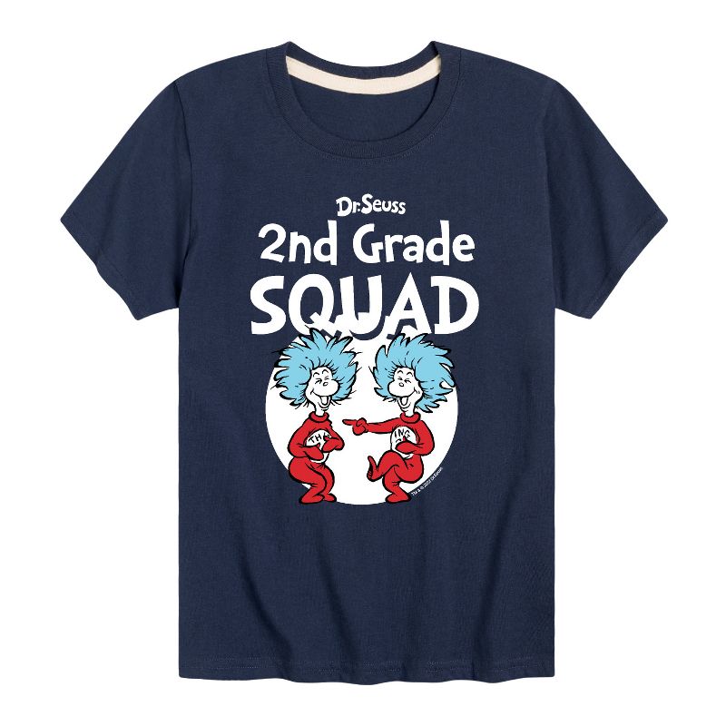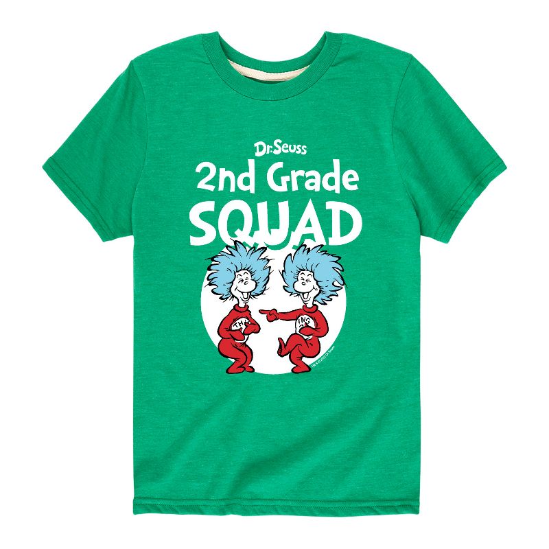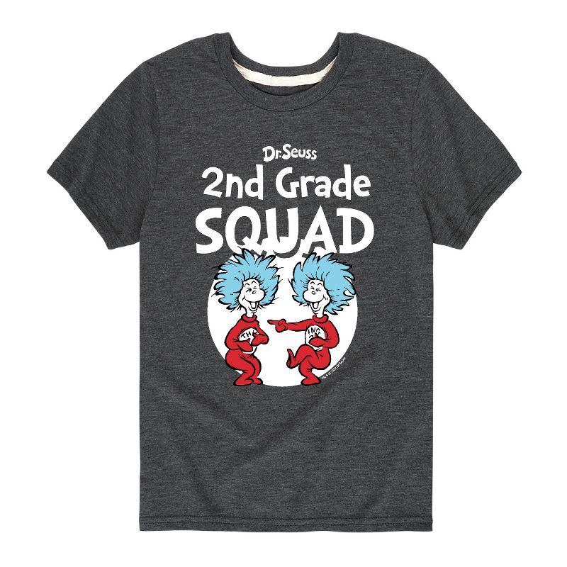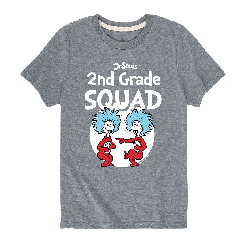 دكتور سوس - فرقة الصف الثاني - المدرسة - الشيء 1 والشيء 2 - تيشيرت شبابي بأكمام قصيرة برسومات جرافيكية - مجموعتنا من الملابس الجرافيكية التي تتميز بشخصيات دكتور سوس المرخصة رسميًا، تُضفي لمسةً من غرابة وروعة سوسفيل على خزانة ملابسك. من القطة ذات القبعة المشاغبة إلى غرينش ذي الرائحة الكريهة، يُبرز كل تصميم شخصيات ومشاهد شهيرة من قصص دكتور سوس الخالدة.