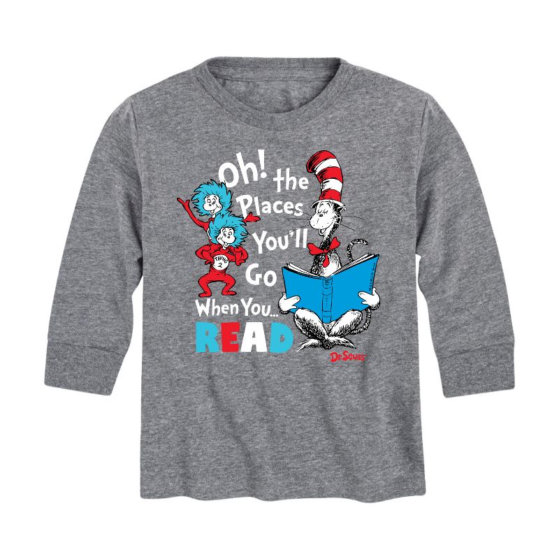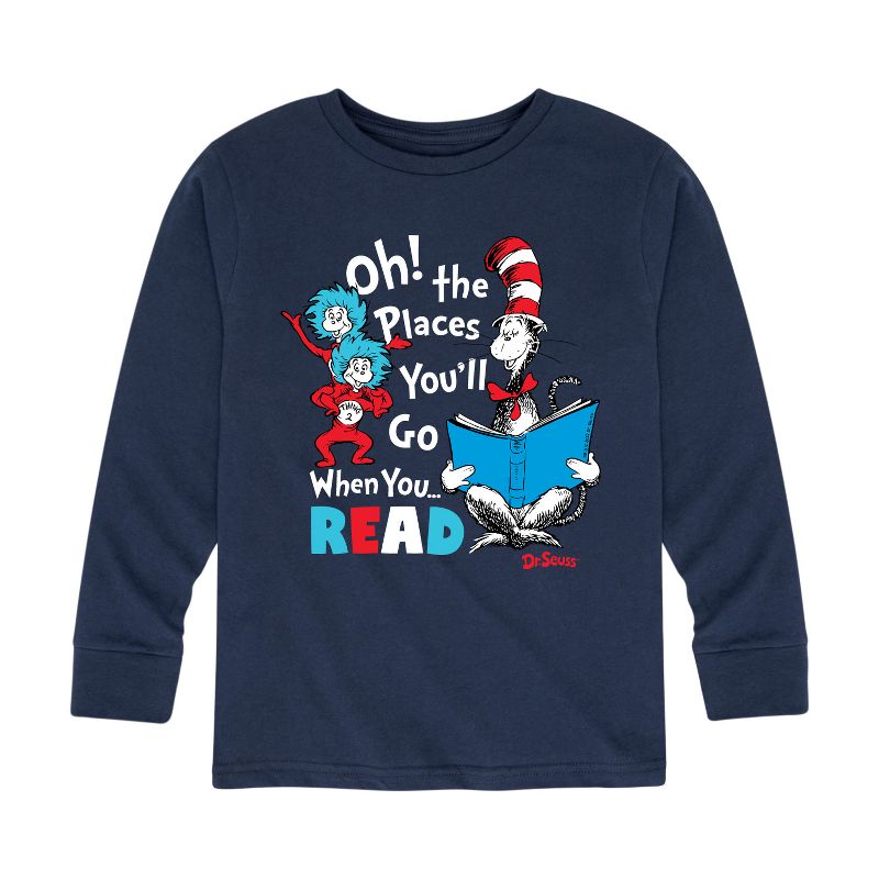 دكتور سوس - أماكن ستزورها وأنت تقرأ - تيشيرت جرافيكي بأكمام طويلة للشباب - مجموعتنا من الملابس الجرافيكية التي تحمل شخصيات دكتور سوس المرخصة رسميًا، ستضفي لمسةً من غرابة وروعة سوسفيل على خزانتك. من القطة ذات القبعة المشاغبة إلى غرينش ذي الرائحة الكريهة، يُبرز كل تصميم شخصيات ومشاهد شهيرة من قصص دكتور سوس الخالدة.