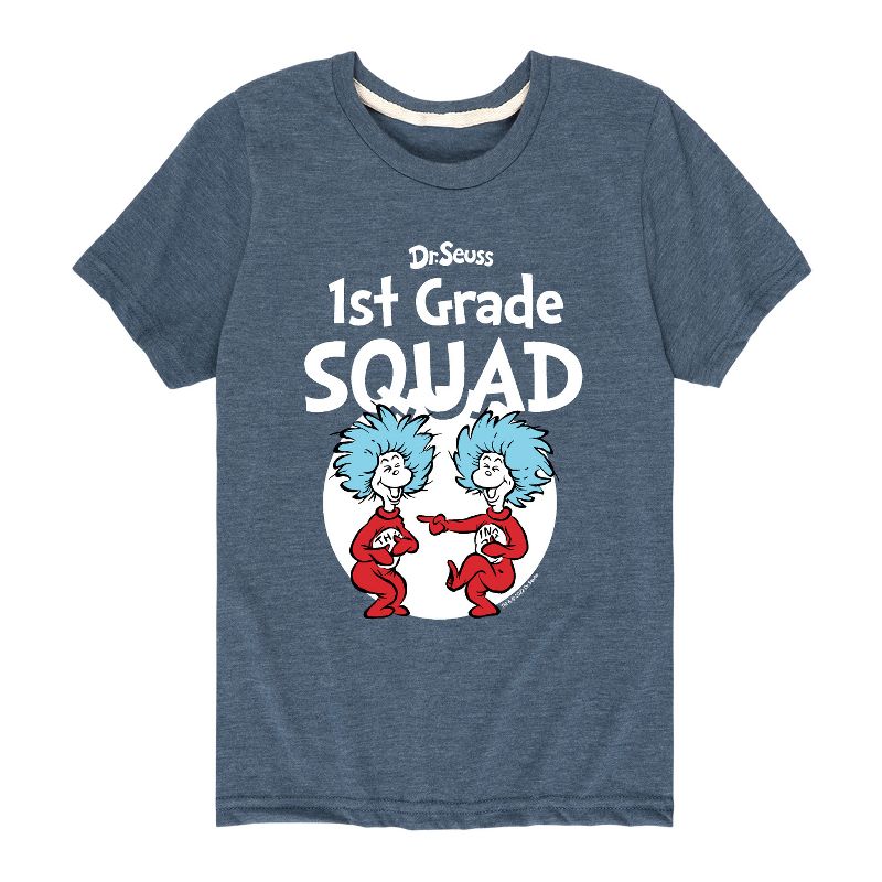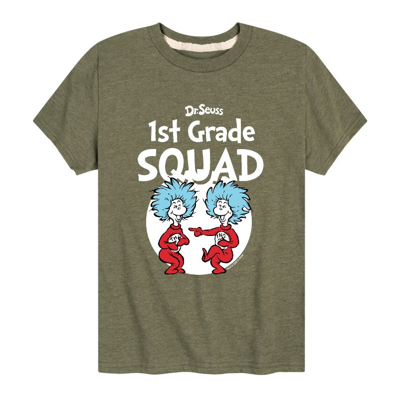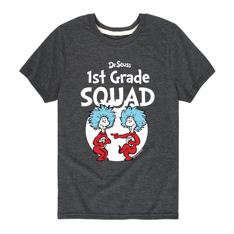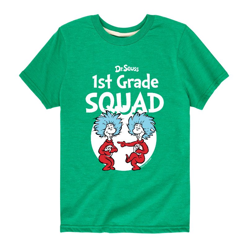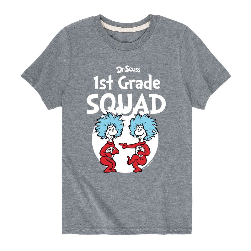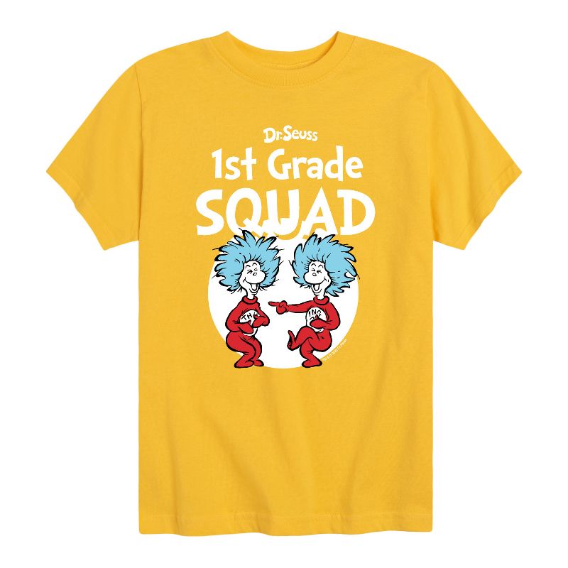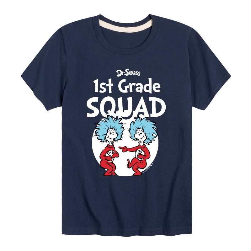 دكتور سوس - فرقة الصف الأول - الشيء 1 والشيء 2 - القط ذو القبعة - تي شيرت جرافيكي للشباب بأكمام قصيرة - مجموعتنا من الملابس الجرافيكية التي تتميز بشخصيات دكتور سوس المرخصة رسميًا، تُضفي لمسةً من غرابة وروعة سوسفيل على خزانة ملابسك. من القط ذو القبعة المشاغب إلى غرينش ذو الرائحة الكريهة، يُبرز كل تصميم شخصيات ومشاهد شهيرة من قصص دكتور سوس الخالدة.