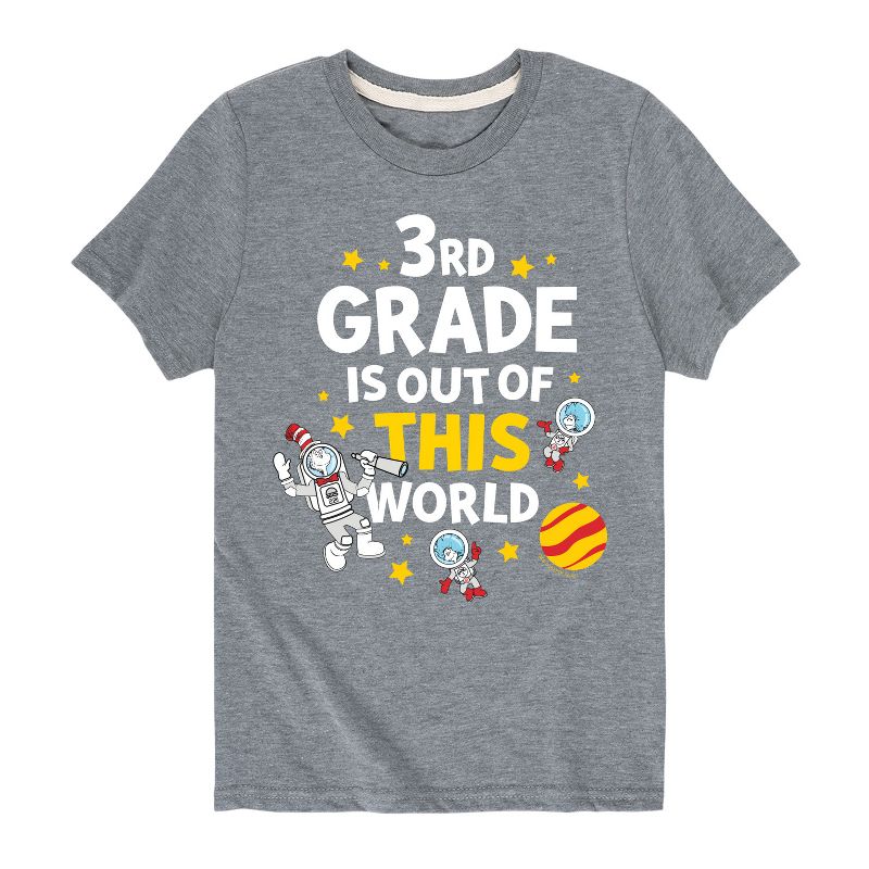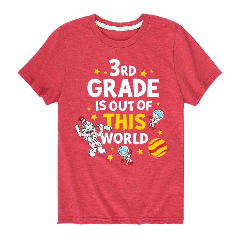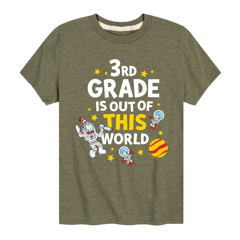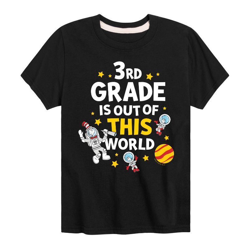 تيشيرت جرافيكي بأكمام قصيرة للشباب من دكتور سوس - الصف الثالث "خارج هذا العالم" - مجموعتنا من الملابس الجرافيكية التي تحمل شخصيات دكتور سوس المرخصة رسميًا، تُضفي لمسةً من غرابة وروعة سوسفيل على خزانة ملابسك. من القطة ذات القبعة المشاغبة إلى غرينش ذي الرائحة الكريهة، يُبرز كل تصميم شخصيات ومشاهد شهيرة من قصص دكتور سوس الخالدة.