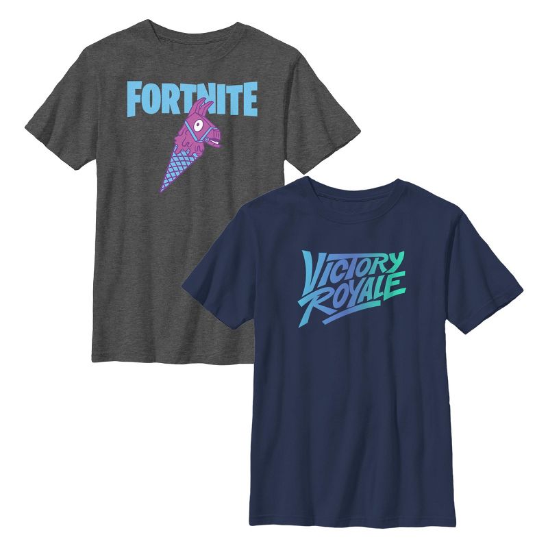 - مثّل حافلة المعركة بأناقة مع هذه التيشيرتات الجديدة للأولاد! تتميز التيشيرت الأول بشعار فورتنايت الشهير ولاما الإمداد المحبوب، والثاني بشعار "النصر الملكي" العريض على الجهة الأمامية.