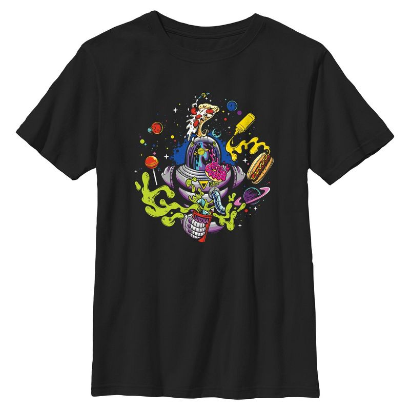 - ارتدِ هذا التيشيرت الأنيق الجديد للأولاد، فهو مثالي لحركات الكيك فليب وخوض غمار الحياة! يُصوّر رائد فضاء في الفضاء محاطًا بالكواكب والنجوم والمأكولات الملونة، بما في ذلك النقانق والبيتزا والدونات والمصاصات وغيرها الكثير.