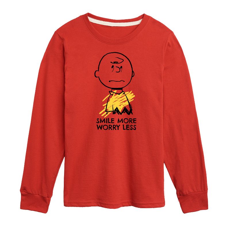 بيناتس - ابتسم أكثر، قلق أقل - تيشيرت شبابي بأكمام طويلة - من أشهر القصص المصورة في التاريخ، تأتي ملابس بيناتس المرخصة رسميًا لعشاقها في كل مكان. أظهر حبك لتشارلي براون، وسنوبي، وودستوك، ولوسي، ولينوس، وبيغبن، وجميع أفراد العصابة. جميع الحقوق محفوظة لبيناتس.