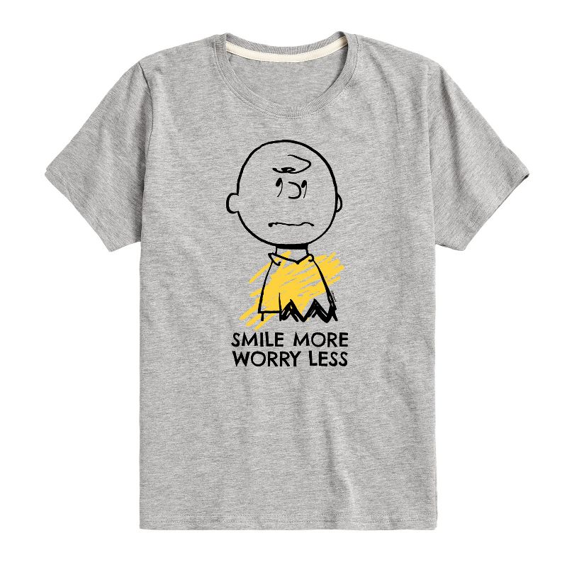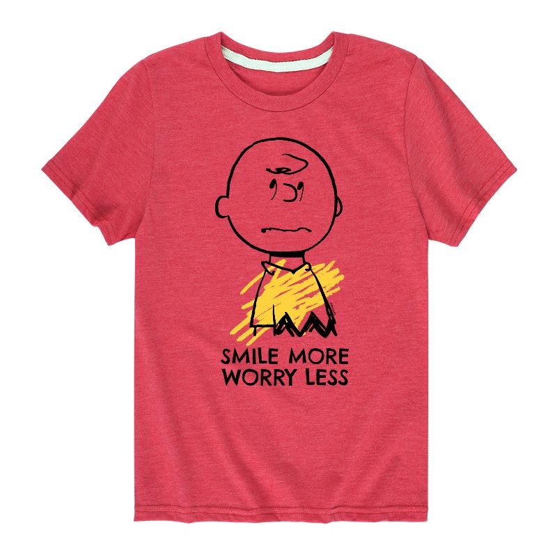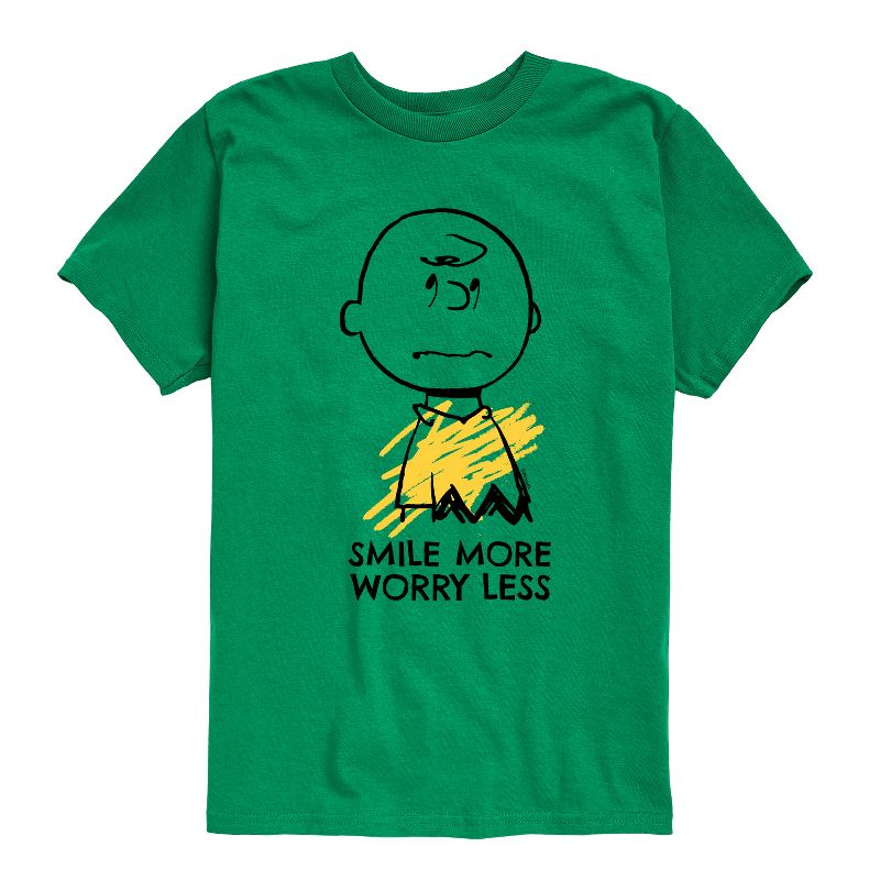 بيناتس - ابتسم أكثر، قلق أقل - تيشيرت شبابي بأكمام قصيرة - من أشهر القصص المصورة في التاريخ، تأتي ملابس بيناتس المرخصة رسميًا لعشاقها في كل مكان. أظهر حبك لتشارلي براون، وسنوبي، وودستوك، ولوسي، ولينوس، وبيغبن، وجميع أفراد العصابة. جميع الحقوق محفوظة لبيناتس.