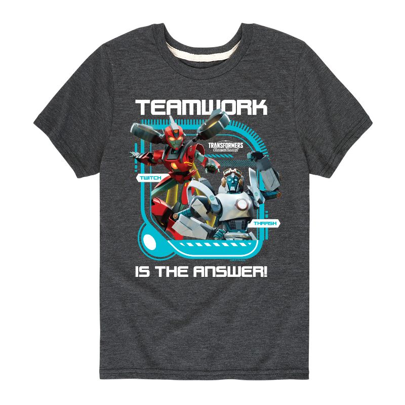 ترانسفورمرز - شرارة الأرض - العمل الجماعي هو الحل - تيشيرت شبابي بأكمام قصيرة - احتفلوا بجوهر ترانسفورمرز من هاسبرو مع ملابس مرخصة رسميًا تتميز بتصاميم فريدة من تصميم هايبرد أباريل. كل قطعة تُجسّد شخصيات محبوبة، وصورًا أيقونية، ولحظات لا تُنسى، مما يُتيح لعشاق ترانسفورمرز طريقة فريدة للتعبير عن شغفهم.