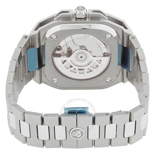 علبة وسوار من الفولاذ المقاوم للصدأ فضي اللون. إطار ثابت من الفولاذ المقاوم للصدأ فضي اللون. ميناء أزرق مع عقارب وعلامات ساعات فضية اللون. علامات دقائق حول الحافة الخارجية. نوع الميناء: تناظري. عقارب وعلامات مضيئة. عرض التاريخ عند موضع الساعة 3. موانئ فرعية لاحتياطي الطاقة. حركة أوتوماتيكية من بيل آند روس عيار 323 باحتياطي طاقة لمدة 72 ساعة. زجاج من الياقوت المقاوم للخدش. تاج لولبي. غطاء خلفي شفاف. شكل العلبة مربع، مقاسها: 41 مم. مشبك قابل للطي مع مفتاح أمان. مقاومة للماء حتى عمق 100 متر / 330 قدم. الوظائف: التاريخ، الساعة، الدقيقة، الثانية، احتياطي الطاقة. معلومات إضافية: العلبة الأصلية، بطاقة الضمان الدولية، دليل الاستخدام (ملحقات كاملة). سلسلة BR-X5. طراز ساعة فاخرة. ملصق الساعة: صناعة سويسرية. ساعة بيل آند روس BR-X5 أوتوماتيكية للرجال بمينا أزرق BR X5 RIBSTSST.