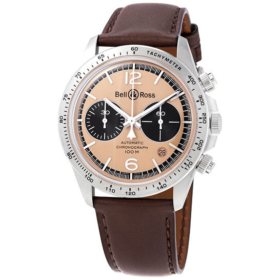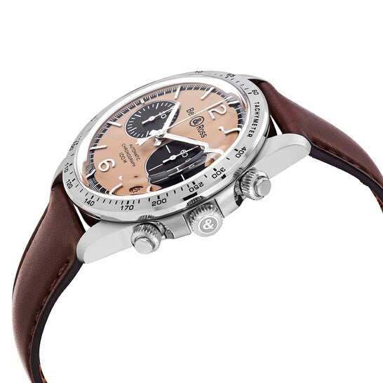 علبة فضية اللون من الفولاذ المقاوم للصدأ مع سوار بني من جلد العجل. إطار فضي اللون من الفولاذ المقاوم للصدأ. ميناء بيج مع عقارب فضية اللون ومؤشرات ساعات بأرقام عربية. مقياس سرعة الدوران. عقارب مضيئة. عرض التاريخ بين موضعي الساعة 4 و5. كرونوغراف - ميناءان فرعيان يعرضان: 60 ثانية و30 دقيقة. حركة أوتوماتيكية من بيل آند روس، عيار BR-CAL.301. زجاج ياقوت مقاوم للخدش. تاج لولبي. حجم العلبة: 41 مم. شكلها دائري. مقاومة للماء حتى عمق 100 متر / 330 قدمًا. الوظائف: كرونوغراف، تاريخ، ساعة، دقيقة، ثانية. معلومات إضافية: إصدار محدود من 500 قطعة. طراز ساعة رسمية. علامة الساعة: صناعة سويسرية. ساعة بيل آند روس BR V1-92 بيليتانكر أوتوماتيكية للرجال، BRV294-BT-ST/SCA.