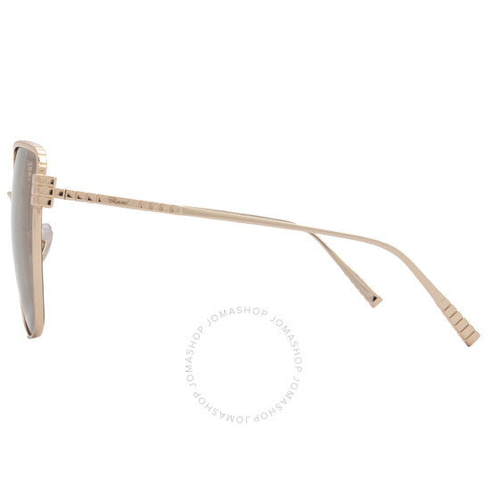 نظارات شمسية من شوبارد. رقم السلسلة: SCHG67M. رمز اللون: 300X. الشكل: فراشة. عرض العدسة: 63 مم. جسر العدسة: 17 مم. طول الذراع: 135 مم. حماية 100% من الأشعة فوق البنفسجية. غير مستقطبة. مادة الإطار: معدن. لون الإطار: ذهبي وردي لامع. نوع العدسات: بني. نمط الحافة: حافة كاملة. رمز UPC/EAN: 190605460573. نظارات شمسية نسائية من شوبارد بتصميم فراشة بني SCHG67M 300X 63.