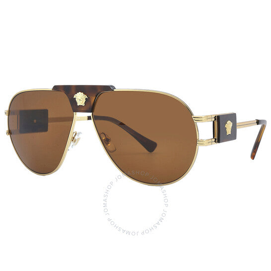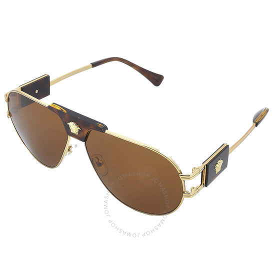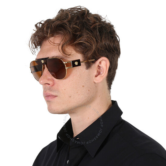 نظارات شمسية من فيرساتشي. رقم السلسلة: VE2252. رمز اللون: 147073. الشكل: طيار. عرض العدسة: 63 مم. جسر العدسة: 12 مم. طول الذراع: 145 مم. حماية 100% من الأشعة فوق البنفسجية. مادة الإطار: معدن. لون الإطار: ذهبي. نوع العدسات: بني. نمط الحافة: حافة كاملة. رمز UPC/EAN: 8056597729987. نظارات شمسية فيرساتشي بنية بايلوت للرجال VE2252 147073 63.