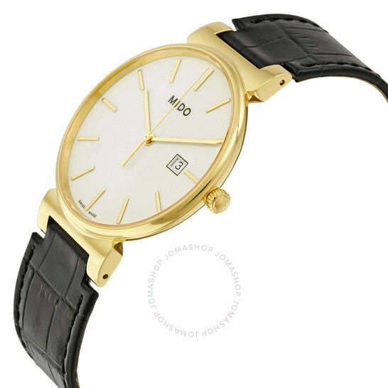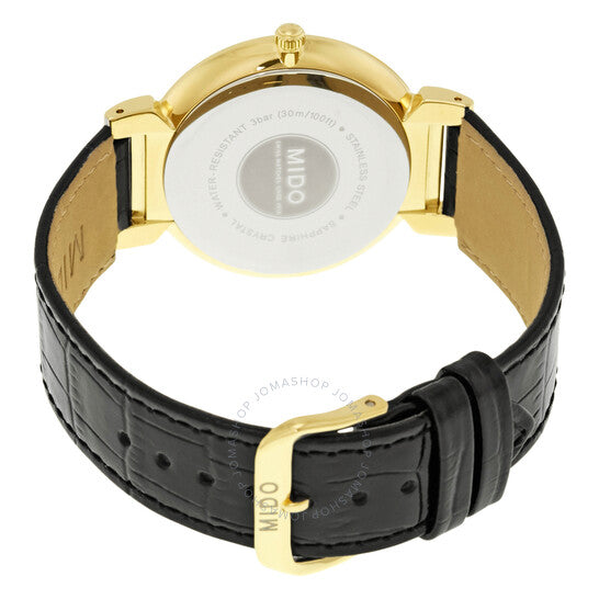 علبة من الفولاذ المقاوم للصدأ مطلية بالذهب ومطلية بتقنية PVD مع سوار جلدي أسود. إطار ذهبي ثابت مطلي بتقنية PVD. ميناء أبيض بعقارب ذهبية اللون وعلامات ساعات. نوع الميناء: تناظري. عرض التاريخ عند موضع الساعة 3. حركة كوارتز عيار 955.412. زجاج ياقوتي مقاوم للخدش. تاج قابل للسحب/الدفع. غطاء خلفي صلب. حجم العلبة: 38 مم. سمكها: 5.8 مم. شكلها دائري. عرض السوار: 16 مم. مشبك تانغ. مقاومة للماء حتى عمق 30 مترًا / 100 قدم. الوظائف: التاريخ، الساعة، الدقائق، الثواني. معلومات إضافية: سوار طويل جدًا. طراز ساعة رسمية. علامة الساعة: صناعة سويسرية. ساعة ميدو كاباليرو للرجال بمينا أبيض، طراز M0096103601100