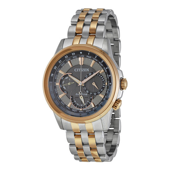 علبة من الفولاذ المقاوم للصدأ بلونين من الذهب الوردي، مع سوار من الفولاذ المقاوم للصدأ بلونين من الذهب الوردي. إطار دوار أحادي الاتجاه. ميناء رمادي داكن مع عقارب وعلامات ساعات ذهبية وردية. علامات دقائق حول الحافة الخارجية. نوع الميناء: تناظري. عقارب وعلامات مضيئة. عرض التاريخ عند موضع الساعة 3. موانئ فرعية لثلاثة أيام، وتاريخ، و24 ساعة. آلية حركة إيكو درايف 8729 إيكو درايف. زجاج معدني مقاوم للخدش. تاج قابل للسحب/الدفع. غطاء خلفي صلب. حجم العلبة: 44 مم. سمك العلبة: 14 مم. شكل دائري. عرض السوار: 24 مم. طول السوار: 8 بوصات. مشبك قابل للطي بزر ضغط. مقاومة للماء حتى عمق 100 متر / 330 قدمًا. الوظائف: التاريخ، اليوم، الساعة، الدقيقة، الثانية، التوقيت 12/24 ساعة. معلومات إضافية: حلقة داخلية دوارة. تصميم ساعة كاجوال. ملصق الساعة: Japan Movt. إصدارات المنتج: BU2026 57H، BU2026.57H، BU202657H. ساعة سيتيزن كالندريير إيكو-درايف للرجال، بمينا رمادي داكن، BU2026-57H.