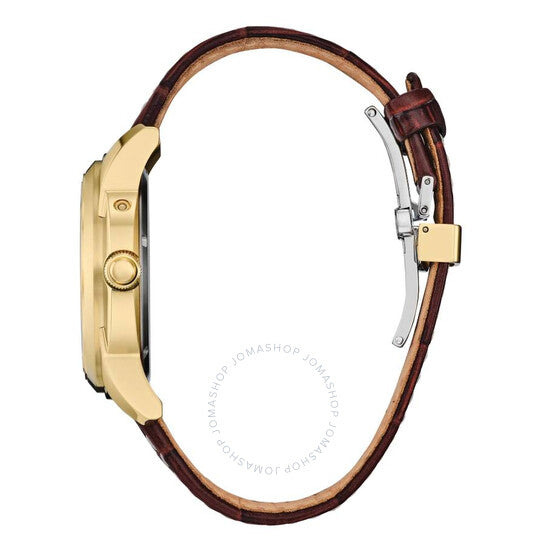 علبة من الفولاذ المقاوم للصدأ بلون ذهبي مع سوار جلدي بني. إطار ثابت من الفولاذ المقاوم للصدأ بلون ذهبي. ميناء ذهبي اللون مع عقارب وعلامات ساعات ذهبية اللون. علامات دقائق حول الحافة الخارجية. نوع الميناء: تناظري. عقارب وعلامات مضيئة. أربعة أقراص فرعية تعرض: الشهر، التاريخ، اليوم، وأطوار القمر. حركة سيتيزن كاليبر إيكو-درايف 8730 إيكو-درايف. كريستال ياقوتي مقاوم للخدش. غطاء خلفي صلب. شكل دائري، مقاس العلبة: 41.8 مم. مشبك بإبزيم. مقاومة للماء حتى عمق 100 متر / 330 قدم. الوظائف: طور القمر، الشهر، التاريخ، اليوم، الساعة، الدقيقة، الثانية، تعمل بالطاقة الشمسية. سلسلة كالندريير. اسم الساعة: جابان موف. ساعة سيتيزن كالندريير مون فيز للرجال بمينا ذهبي، BU0082-06P.