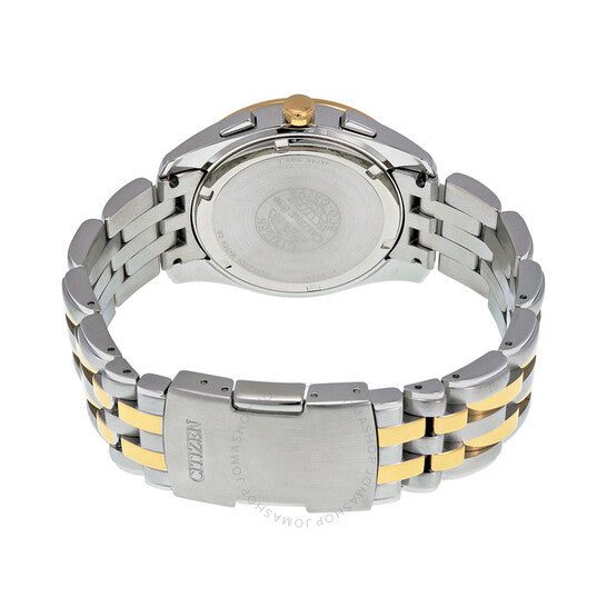 علبة من الفولاذ المقاوم للصدأ مع سوار من الفولاذ المقاوم للصدأ ثنائي اللون (فضي وذهبي). إطار ثابت من الفولاذ المقاوم للصدأ. ميناء أسود بعقارب مضيئة وعلامات ساعات عصا. علامات دقائق. مقياس الأشهر حول الحافة الخارجية. نافذة عرض التاريخ عند موضع الساعة الرابعة. تقويم دائم. ضبط تلقائي للأشهر الفردية والزوجية والسنوات الكبيسة حتى عام 2100. وظيفة التنبيه. ثلاثة أقراص فرعية تعرض: عرض الوظائف، 24 ساعة (توقيت مزدوج) ويوم الأسبوع. آلية حركة إيكو درايف. زجاج معدني مقاوم للخدش وغير عاكس. تاج لولبي. غطاء خلفي لولبي. احتياطي طاقة يدوم 500 يوم. مؤشر شحن منخفض. قطر العلبة: 40 مم. سمكها: 10 مم. مشبك قابل للطي بزر ضغط. مقاومة للماء حتى عمق 100 متر / 330 قدمًا. ساعة سيتيزن كاليبر 8700 إيكو درايف بتقويم دائم للرجال BL8004-53E.