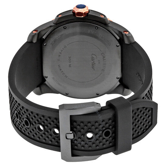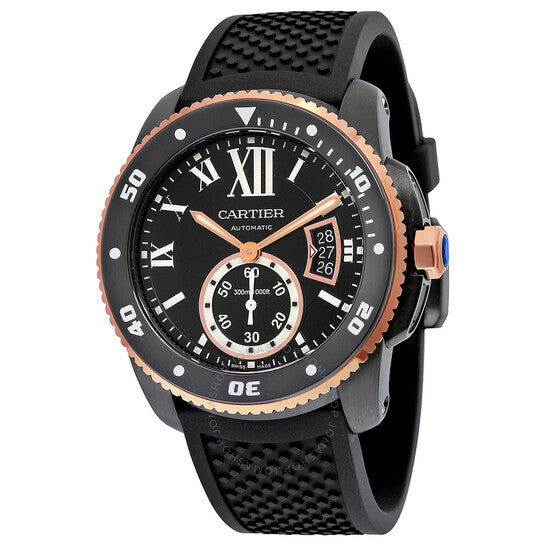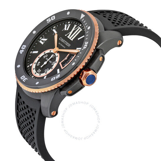 علبة من الفولاذ المقاوم للصدأ مطلية بمادة ADLC سوداء مع سوار مطاطي أسود. إطار دوار أحادي الاتجاه من الذهب الوردي عيار 18 قيراطًا مع حلقة علوية من الفولاذ المقاوم للصدأ مطلية بمادة ADLC سوداء. ميناء أسود مع عقارب وعلامات ساعات ذهبية وردية اللون وأرقام رومانية. علامات دقائق حول الحافة الخارجية. نوع الميناء: تناظري. عقارب وعلامات مضيئة. عرض التاريخ عند موضع الساعة 3. ميناء فرعي للثواني عند موضع الساعة 6. حركة أوتوماتيكية مع احتياطي طاقة لمدة 48 ساعة. كريستال ياقوت مقاوم للخدش. تاج لولبي مرصع بحجر سبينل صناعي متعدد الأوجه. غطاء خلفي صلب. قطر العلبة: 42 مم. سمكها: 11 مم. شكل دائري. مشبك تانغ. مقاومة للماء حتى عمق 300 متر / 1000 قدم. الوظائف: التاريخ، الساعة، الدقيقة، الثانية. طراز ساعة فاخرة. علامة الساعة: صناعة سويسرية. ساعة كارتييه كاليبر دي كارتييه دايفر أوتوماتيكية بمينا سوداء ومطاط أسود للرجال W2CA0004.