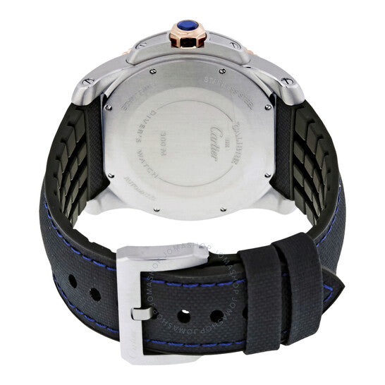 علبة من الفولاذ المقاوم للصدأ مع حزام مطاطي أسود وسطح من جلد العجل الأزرق. حافة عملة دوارة أحادية الاتجاه من الذهب الوردي عيار 18 قيراطًا مع حلقة سيراميك زرقاء مطعمة. ميناء أزرق مع عقارب مضيئة على شكل سيف بلون الذهب الوردي وأرقام رومانية وعلامات للساعات. علامات للدقائق حول الحافة الخارجية. نوع الميناء: تناظري. عقارب وعلامات مضيئة. عرض التاريخ عند موضع الساعة 3. ميناء فرعي للثواني الصغيرة. حركة أوتوماتيكية من كارتييه عيار 1904-PS MC، تحتوي على 27 جوهرة، تنبض بمعدل 28800 ذبذبة في الساعة، ولديها احتياطي طاقة لمدة 48 ساعة تقريبًا. كريستال ياقوت مقاوم للخدش. تاج لولبي. غطاء خلفي صلب. شكل دائري. حجم الهيكل: 42 مم. سمك الهيكل: 11 مم. عرض السوار: 20 مم. طول السوار: 8 بوصات. مشبك تانغ. مقاومة للماء حتى عمق 300 متر / 1000 قدم. الوظائف: التاريخ، الساعة، الدقيقة، الثانية. سلسلة كاليبر دو كارتييه دايفر. تصميم فاخر. علامة الساعة: صناعة سويسرية. ساعة كارتييه كاليبر دو كارتييه دايفر أوتوماتيكية للرجال W2CA0008.