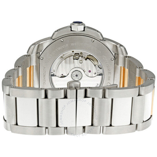علبة من الفولاذ المقاوم للصدأ مع سوار من الفولاذ المقاوم للصدأ بوصلات من الذهب الوردي عيار 18 قيراطًا. إطار ثابت من الذهب الوردي عيار 18 قيراطًا. ميناء فضي لامع بعقارب سوداء مضيئة وعلامات ساعات رقمية عربية أو عصا. علامات دقائق حول الحافة الخارجية. نافذة عرض التاريخ عند موضع الساعة 3. ميناء فرعي للثواني فوق موضع الساعة 6. حركة أوتوماتيكية باحتياطي طاقة لمدة 48 ساعة. زجاج من الياقوت المقاوم للخدش. تاج مثمن الأضلاع مع عمود فقري صناعي أزرق متعدد الأوجه. غطاء خلفي للعلبة ببرغي. قطر العلبة: 42 مم. مشبك قابل للطي. مقاومة للماء حتى عمق 30 مترًا / 100 قدم. الوظائف: الساعات، الدقائق، الثواني، التاريخ. ساعة كارتييه كاليبر دو كارتييه للرجال 7100036.