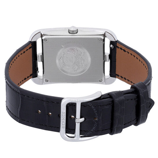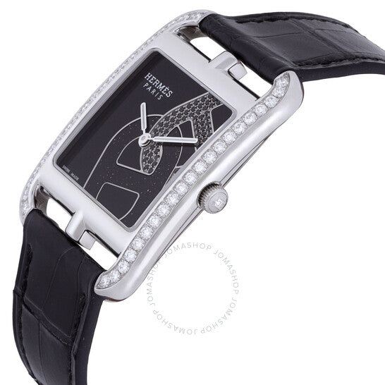 علبة من الفولاذ المقاوم للصدأ مرصعة بالألماس (0.75 قيراط). سوار من جلد التمساح الأسود. إطار ثابت. ميناء أسود. نوع الميناء: تناظري. حركة كوارتز. زجاج ياقوت مقاوم للخدش. تاج قابل للسحب/الدفع. غطاء خلفي صلب. شكل العلبة مربع، مقاسها: 29 مم. مشبك بإبزيم. مقاومة للماء حتى عمق 30 مترًا / 100 قدم. الوظائف: الساعات، الدقائق. سلسلة كيب كود. طراز ساعة رسمية. علامة الساعة: صناعة سويسرية. ساعة هيرمس كيب كود كوارتز نسائية بمينا سوداء، 047237WW00.