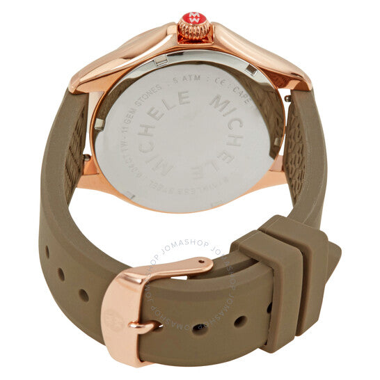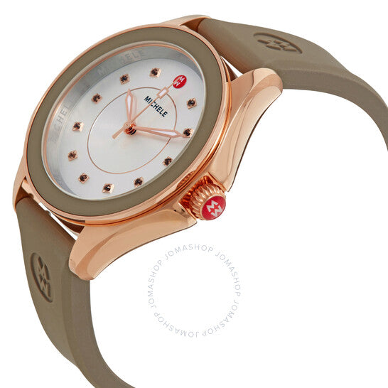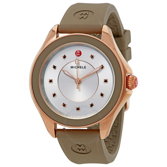 علبة من الفولاذ المقاوم للصدأ مطلية بالذهب الوردي بتقنية PVD، مع سوار من مطاط السيليكون بلون بني داكن. إطار ثابت مطلي بالذهب الوردي بتقنية PVD مع تطعيم من السيليكون بلون بني داكن. ميناء فضي بعقارب مضيئة بلون الذهب الوردي وعلامات ساعات من التوباز الأحمر. نوع الميناء: تناظري. عقارب مضيئة. آلية حركة كوارتز. زجاج معدني مقاوم للخدش. تاج أحمر من الكابوشون. غطاء خلفي صلب. حجم العلبة: 40 مم. سمكها: 11 مم. شكلها دائري. عرض السوار: 18 مم. مشبك تانغ. مقاومة للماء حتى عمق 50 مترًا / 165 قدمًا. الوظائف: الساعات، الدقائق، الثواني. معلومات إضافية: مناسبة بشكل عام للسباحة الترفيهية القصيرة، ولكنها ليست مناسبة للغوص أو الغطس السطحي. تصميم كاجوال. ساعة ميشيل كيب النسائية MWW27A000014.