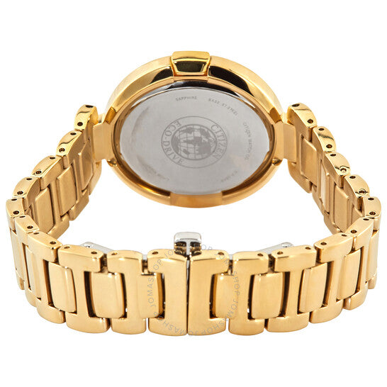 علبة وسوار من الفولاذ المقاوم للصدأ بلون الذهب الأصفر. إطار ثابت بلون الذهب الأصفر. ميناء فضي بعقارب ذهبية اللون وعلامات ساعات من الماس. أرقام رومانية عند موضعي الساعة 6 و12. آلية حركة إيكو درايف. زجاج ياقوتي مقاوم للخدش. غطاء خلفي صلب. شكل بيضاوي. مقاس العلبة: 34 مم. عرض السوار: 16 مم. مشبك قابل للطي. مقاومة للماء حتى عمق 50 مترًا / 165 قدمًا. الوظائف: الساعات، الدقائق. سلسلة كابيلا. ساعة رسمية. ساعة سيتيزن كابيلا النسائية بمينا فضي مرصعة بالألماس EX1512-53A.
