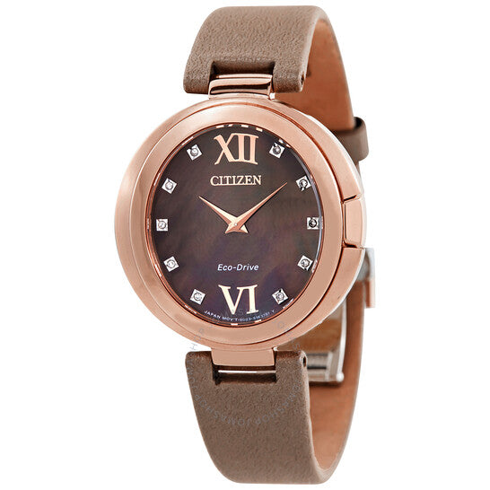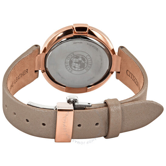 علبة من الفولاذ المقاوم للصدأ بلون الذهب الوردي مع سوار جلدي بني. إطار ثابت من الفولاذ المقاوم للصدأ بلون الذهب الوردي. ميناء رمادي داكن مع عقارب بلون الذهب الوردي وعلامات ساعات من الماس. أرقام رومانية عند موضعي الساعة 6 و12. نوع الميناء: تناظري. حركة سيتيزن كاليبر B023 إيكو-درايف. زجاج ياقوت مقاوم للخدش. تاج مدمج. غطاء خلفي صلب. شكل العلبة بيضاوي، مقاسها: 34 مم × 34 مم. عرض السوار: 16 مم. مشبك قابل للطي. مقاومة للماء حتى عمق 50 مترًا / 165 قدمًا. الوظائف: الساعات، الدقائق. سلسلة كابيلا. طراز ساعة رسمية. ساعة سيتيزن كابيلا الماسية النسائية بمينا رمادي داكن EX1513-00Y.