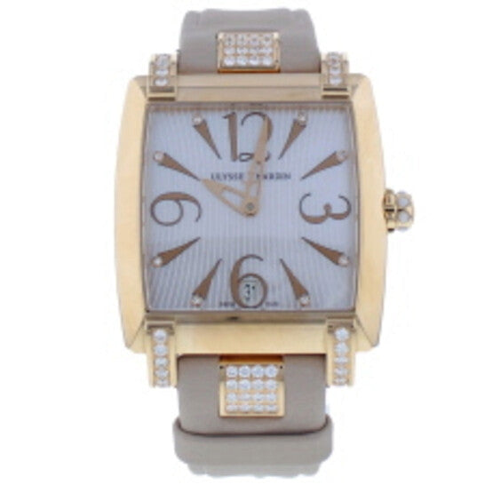 علبة من الذهب الوردي عيار 18 قيراطًا مع سوار من الساتان البيج. إطار ثابت مرصع بالألماس. ميناء من عرق اللؤلؤ مع عقارب بلون الذهب الوردي وأرقام عربية للساعات. نوع الميناء: تناظري. عرض التاريخ عند موضع الساعة السادسة. حركة أوتوماتيكية. زجاج ياقوت مقاوم للخدش. غطاء خلفي شفاف. شكل العلبة مربع. حجم العلبة: 34 مم × 43 مم. مقاومة للماء حتى عمق 50 مترًا / 165 قدمًا. الوظائف: التاريخ، الساعة، الدقائق، الثواني. تصميم ساعة فاخرة. ساعة أوليس ناردين كابريس الأوتوماتيكية النسائية 136-91/695.