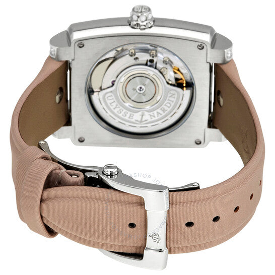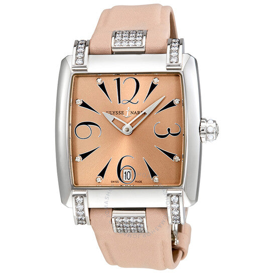 علبة من الفولاذ المقاوم للصدأ فضية اللون مع سوار ساتان بلون السلمون. إطار ثابت من الفولاذ المقاوم للصدأ فضي اللون. ميناء بلون السلمون مع عقارب فضية اللون وأرقام عربية للساعات. نوع الميناء: تناظري. عرض التاريخ عند موضع الساعة السادسة. حركة أوتوماتيكية. زجاج ياقوت مقاوم للخدش. غطاء خلفي شفاف هيكلي. حجم العلبة: 34 مم × 35.4 مم. شكل العلبة مربع. مشبك قابل للطي. مقاومة للماء حتى عمق 50 مترًا / 165 قدمًا. الوظائف: التاريخ، الساعة، الدقيقة، الثانية. تصميم ساعة فاخرة. علامة الساعة: صناعة سويسرية. ساعة أوليس ناردين كابريس، مينا لون السلمون، أوتوماتيكية نسائية، 133-91C/06-05.