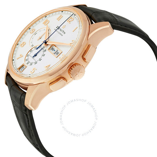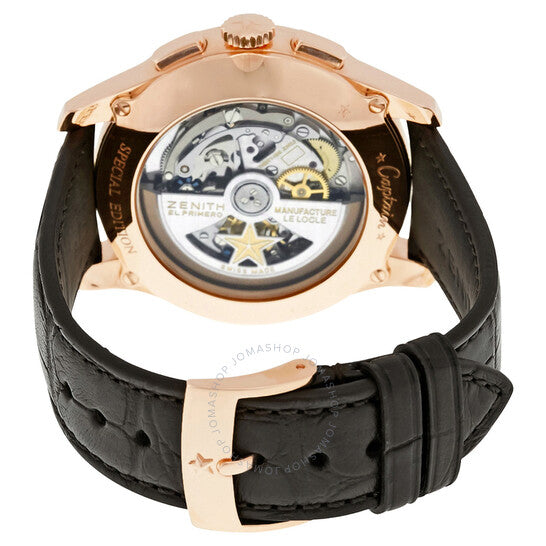علبة من الذهب الوردي عيار ١٨ قيراطًا مع سوار من الجلد البني والمطاط. إطار ثابت من الذهب الوردي عيار ١٨ قيراطًا. ميناء أبيض بعقارب من الذهب الوردي وعلامات ساعات بأرقام عربية. علامات دقائق حول الحافة الخارجية. نوع الميناء: تناظري. عرض التاريخ عند موضع الساعة ٦، وعرض اليوم والشهر عند موضع الساعة ٣. كرونوغراف - ميناءان فرعيان يعرضان: ٦٠ دقيقة عند موضع الساعة ٦، وثوانٍ صغيرة عند موضع الساعة ٩. حركة أوتوماتيكية من زينيث كاليبر إل بريميرو ٤٠٥٤ مع احتياطي طاقة يصل إلى ٥٠ ساعة تقريبًا. زجاج ياقوت مقاوم للخدش والانعكاس. ظهر علبة من زجاج ياقوت شفاف. حجم العلبة: ٤٢ مم. سمكها: ١٣.٨٥ مم. شكل العلبة دائري. مشبك تانغ. مقاومة للماء حتى عمق ٥٠ مترًا / ١٦٥ قدمًا. الوظائف: تقويم سنوي، كرونوغراف، عجلة عمودية، شهر، تاريخ، يوم، ساعة، دقيقة، ثانية صغيرة. تصميم ساعة فاخرة. علامة الساعة: صناعة سويسرية. ساعة زينيث كابتن أوتوماتيكية كرونوغراف للرجال 18.2071.4054/01.C711.