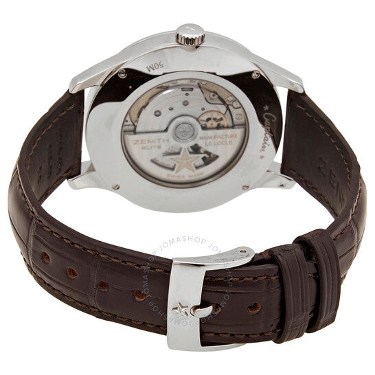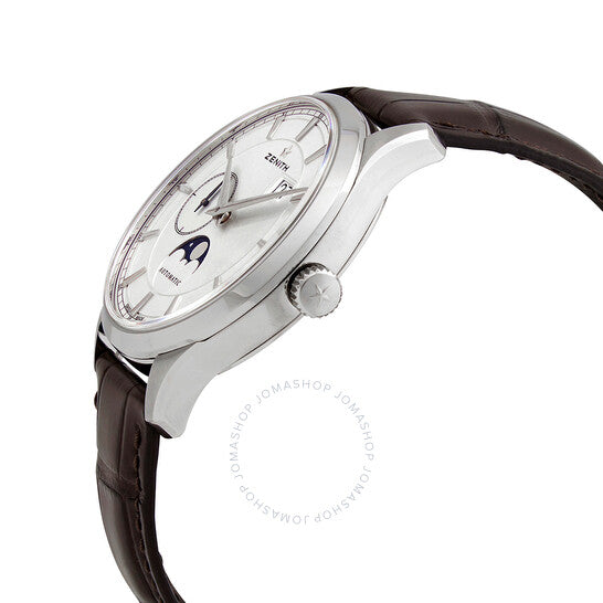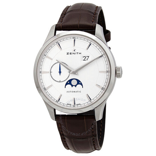 علبة من الفولاذ المقاوم للصدأ مع سوار جلدي بني. إطار ثابت من الفولاذ المقاوم للصدأ. ميناء فضي اللون بعقارب وعلامات ساعات فضية اللون. علامات دقائق حول الحافة الخارجية. نوع الميناء: تناظري. عرض التاريخ بين موضعي الساعة 1 و2. ميناءان فرعيان يعرضان: 60 ثانية وطور القمر. حركة أوتوماتيكية من عيار زينيث إيليت 691 مع احتياطي طاقة يصل إلى 50 ساعة. زجاج ياقوت مقاوم للخدش. تاج قابل للسحب/الدفع. غطاء خلفي هيكلي. قطر العلبة: 40 مم. سمكها: 10.35 مم. شكلها دائري. مشبك تانغ. مقاومة للماء حتى عمق 50 مترًا / 165 قدمًا. الوظائف: التاريخ، الساعات، الدقائق، الثواني، وطور القمر. تصميم ساعة فاخرة. علامة الساعة: صناعة سويسرية. إصدارات المنتج: 03 2143 691/01 C498، 03-2143-691/01-C498، 03/2143/691/01/C498، 032143691/01C498. ساعة زينيث كابتن مون فيز للرجال، أوتوماتيكية، بمينا فضي، 03214369101C498.