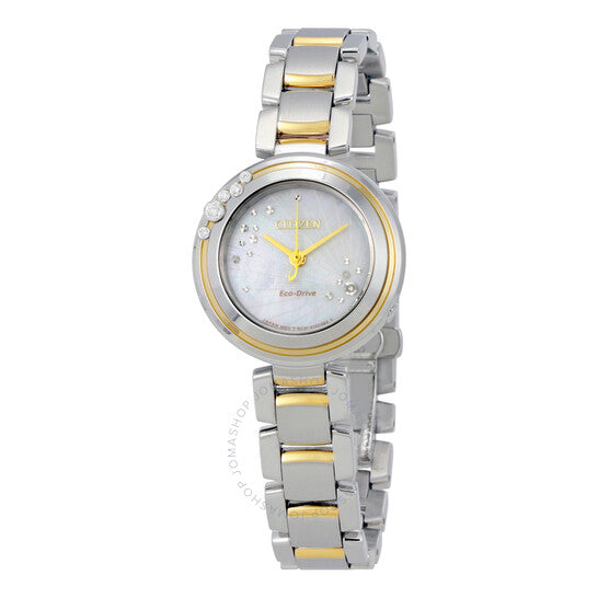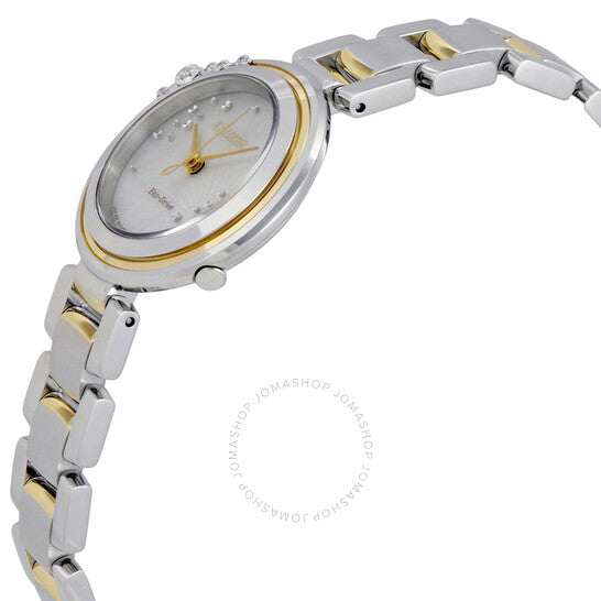 علبة من الفولاذ المقاوم للصدأ فضية اللون مع سوار من الفولاذ المقاوم للصدأ ثنائي اللون (فضي وذهبي). إطار ثابت فضي وذهبي اللون. ميناء أبيض من عرق اللؤلؤ مع عقارب ذهبية اللون. نوع الميناء: تناظري. حركة Citizen عيار Eco-Drive E031 eco-drive. زجاج ياقوت مقاوم للخدش. تاج قابل للسحب/الدفع. غطاء خلفي صلب. شكل دائري، مقاس العلبة: 28 مم، سمكها: 6/0 مم. عرض السوار: 12.5 مم. مشبك قابل للطي بزر ضغط. مقاومة للماء حتى عمق 50 مترًا / 165 قدمًا. الوظائف: الساعات، الدقائق، الثواني. معلومات إضافية: مناسبة بشكل عام للسباحة الترفيهية القصيرة، ولكنها ليست مناسبة للغوص أو الغطس السطحي. طراز ساعة رسمية. علامة الساعة: Japan Movt. ساعة Citizen Carina النسائية بمينا من عرق اللؤلؤ EM0464-59D.