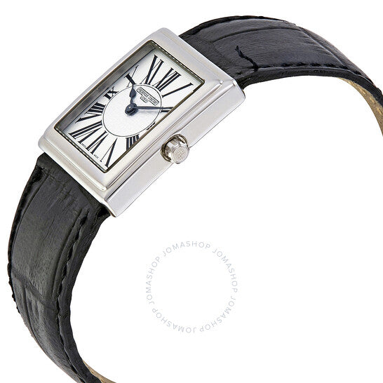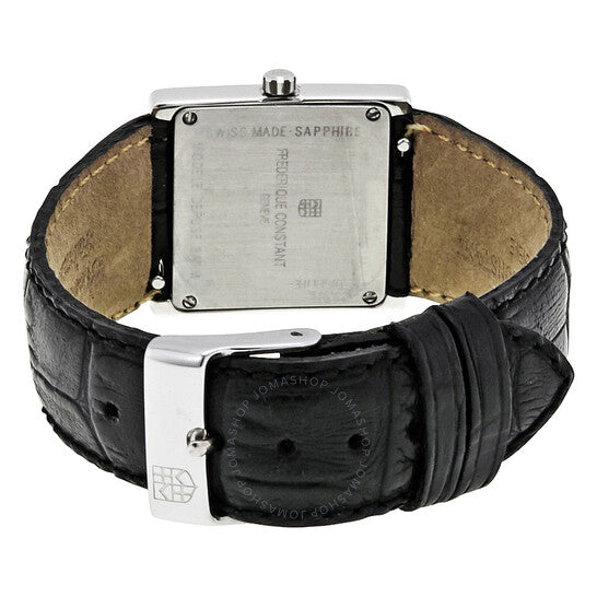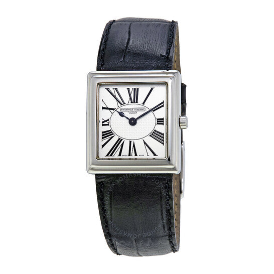 علبة من الفولاذ المقاوم للصدأ مع سوار جلدي أسود. إطار ثابت من الفولاذ المقاوم للصدأ. ميناء فضي مزخرف بعلامات ساعات بأرقام رومانية. نوع الميناء: تناظري. حركة كوارتز سويسرية. زجاج ياقوت مقاوم للخدش. تاج قابل للسحب/الدفع. غطاء خلفي صلب. أبعاد العلبة: ٢٤.٥ مم × ٢٧ مم. سُمك العلبة: ٦.٣ مم. شكل العلبة مربع. عرض السوار: ١٦ مم. طول السوار: ٨ بوصات. مشبك قابل للطي. مقاومة للماء حتى عمق ٣٠ مترًا / ١٠٠ قدم. الوظائف: الساعات، الدقائق. معلومات إضافية: غير مناسبة للاستخدام لفترات طويلة في الماء، مثل السباحة. طراز ساعة رسمية. علامة الساعة: صناعة سويسرية. ساعة فريدريك كونستانت كاريه النسائية بمينا فضي، FC-202RW1C6.