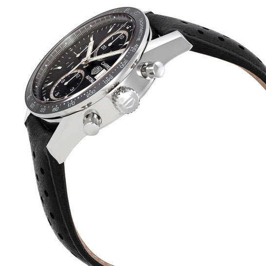 علبة من الفولاذ المقاوم للصدأ مع سوار جلدي أسود. إطار ثابت من الفولاذ المقاوم للصدأ مع حلقة ألومنيوم سوداء مرصعة بعلامات قياس سرعة الدوران. ميناء أسود بعقارب وعلامات ساعات فضية مضيئة. علامات دقائق حول الحافة الخارجية. نوع الميناء: تناظري. عقارب وعلامات مضيئة. عرض التاريخ عند موضع الساعة 3. كرونوغراف - ثلاثة أقراص فرعية تعرض: 60 ثانية، 30 دقيقة، و12 ساعة. حركة تاغ هوير كاليبر 16 أوتوماتيكية، مبنية على فالجو 7750، تحتوي على 25 جوهرة، تنبض بتردد 28800 ذبذبة في الساعة، ولديها احتياطي طاقة لمدة 42 ساعة تقريبًا. زجاج ياقوت مقاوم للخدش. تاج قابل للسحب/الدفع. غطاء خلفي صلب. شكل دائري، حجم العلبة: 41 مم. عرض السوار: 20 مم. مشبك قابل للطي. مقاومة للماء حتى عمق 100 متر / 330 قدمًا. الوظائف: كرونوغراف، مقياس سرعة الدوران، التاريخ، الساعات، الدقائق، الثواني الصغيرة. سلسلة كاريرا. تصميم ساعة فاخر. علامة الساعة: صناعة سويسرية. إصدارات الساعة: CV201AJ FC6357، CV201AJ-FC6357، CV201AJ/FC6357، CV201AJFC6357. ساعة تاغ هوير كاريرا أوتوماتيكية للرجال بمينا أسود، كرونوغراف CV201AJ.FC6357.